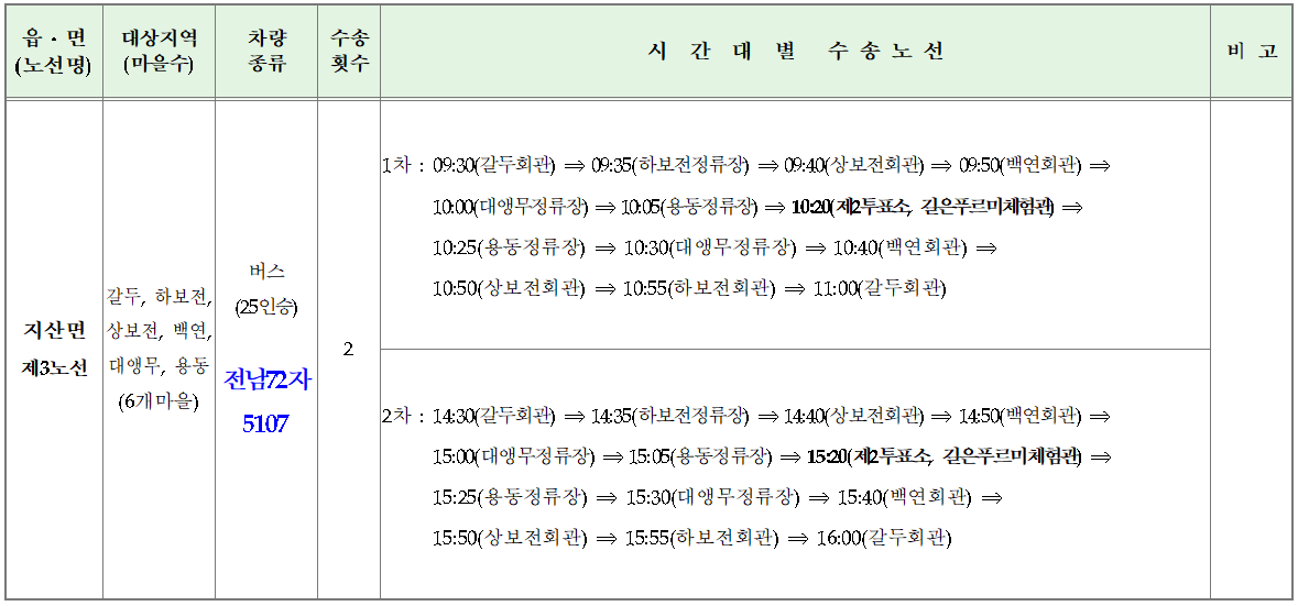 2025. 6. 3. 실시하는 제21대 대통령선거에 있어 교통불편지역 선거인에 대한 교통편의 제공을 다음과 같이 안내합니다. o 운행시간 : 2025. 6. 3.(화) 07:30 ~ 17: 20 o 운행노선 : 4개 노선