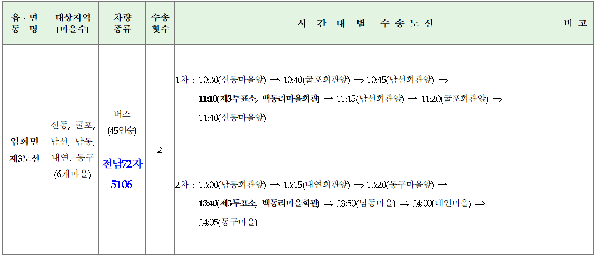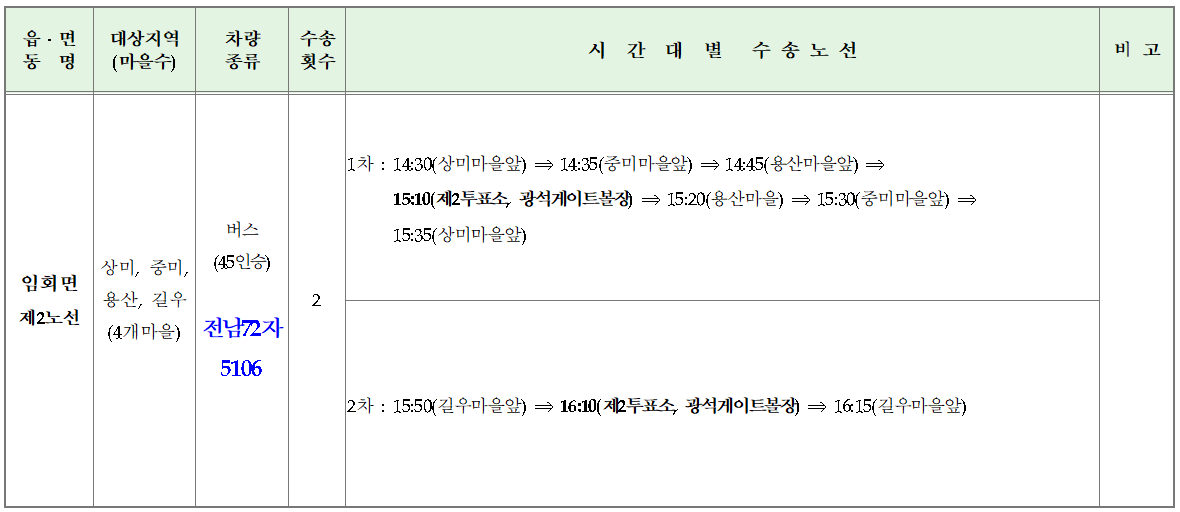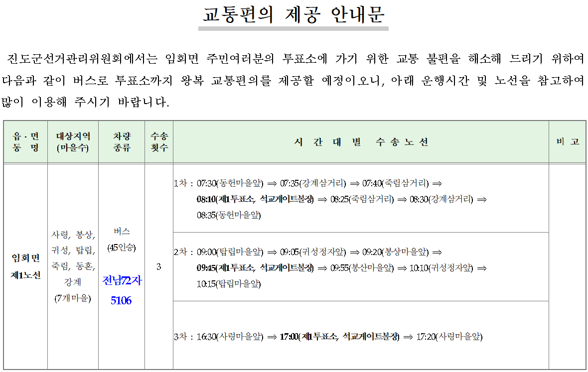 2025. 6. 3. 실시하는 제21대 대통령선거에 있어 교통불편지역 선거인에 대한 교통편의 제공을 다음과 같이 안내합니다. o 운행시간 : 2025. 6. 3.(화) 07:30 ~ 17: 20 o 운행노선 : 3개 노선