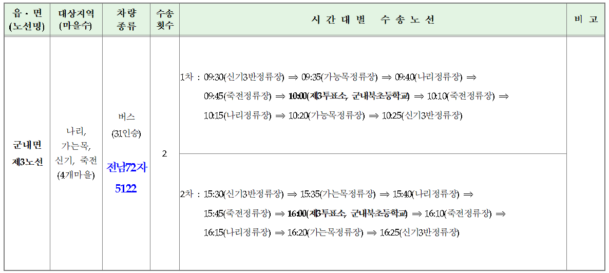 2025. 6. 3. 실시하는 제21대 대통령선거에 있어 교통불편지역 선거인에 대한 교통편의 제공을 다음과 같이 안내합니다. o 운행시간 : 2025. 6. 3.(화) 07:30 ~ 17: 20 o 운행노선 : 3개 노선
