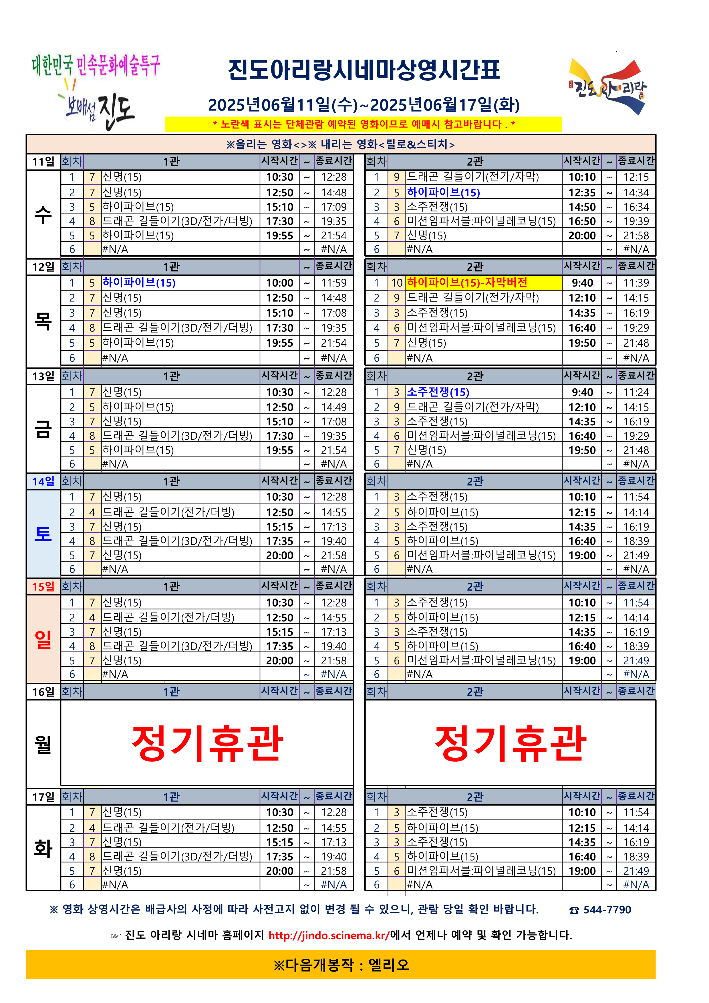 진도아리랑 시네마 상영시간표 <2025.06.11(수) ~ 06.17(화)> 안내드립니다.