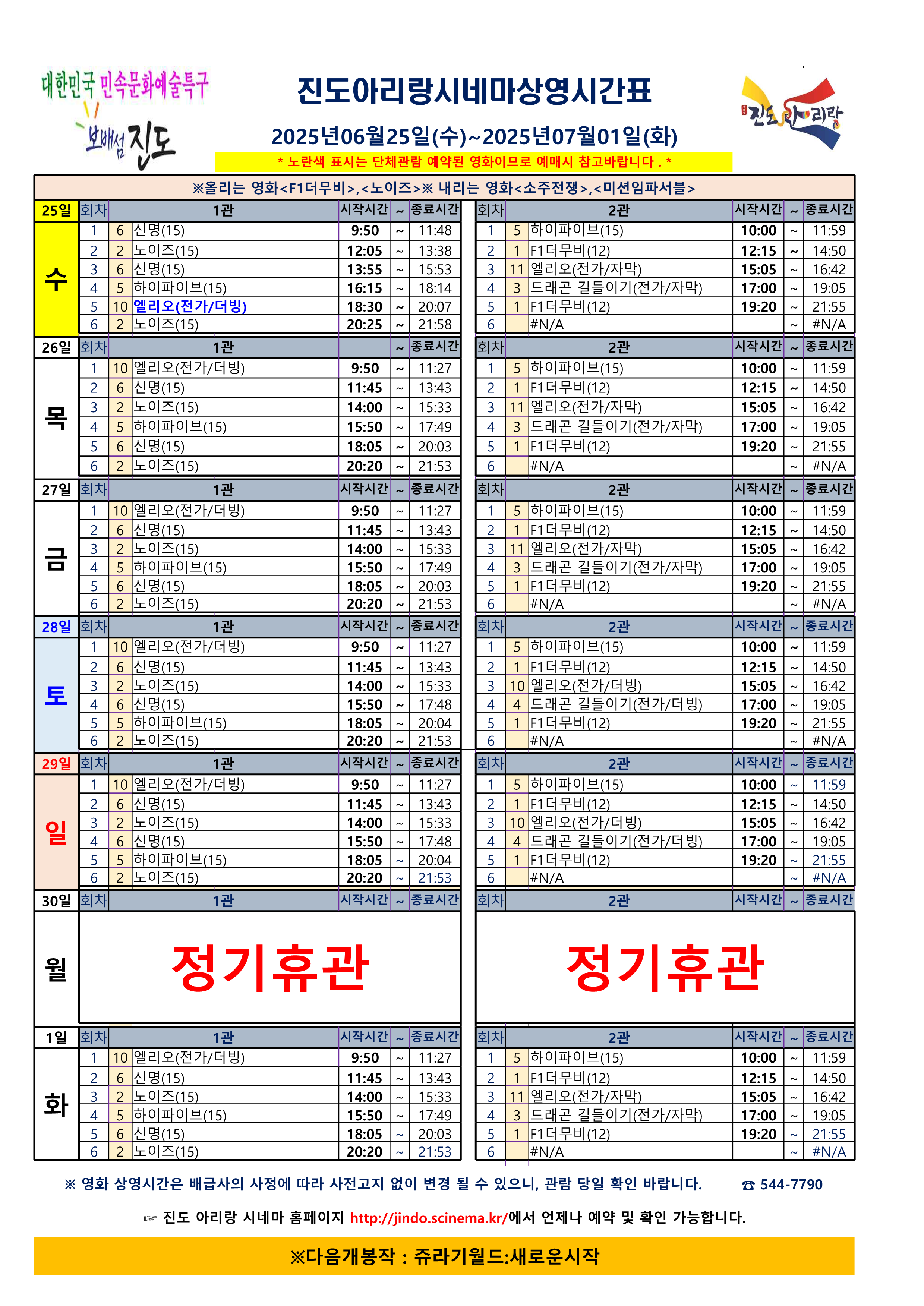 진도아리랑시네마 상영스케줄<2025.06.25(수) ~ 07. 01(화)> 안내드립니다.
