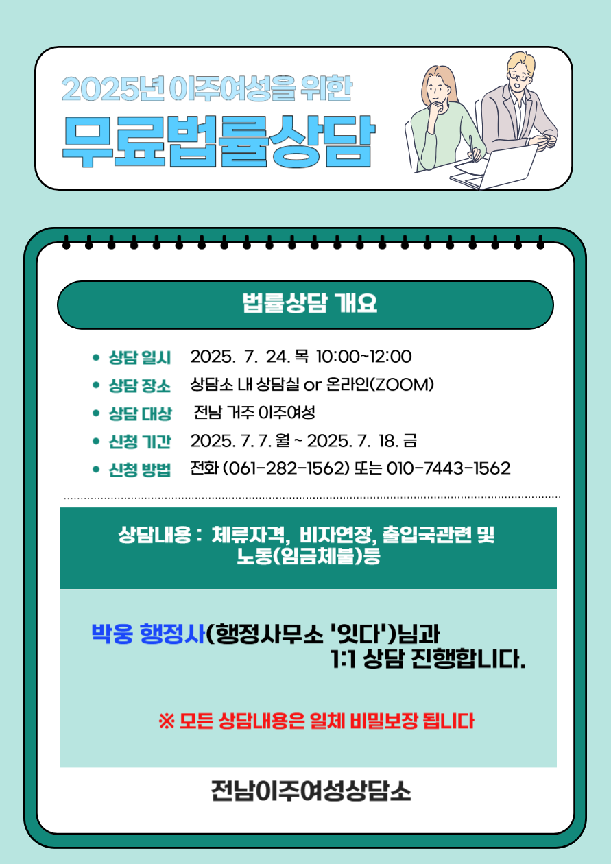 전남이주여성상담소에서는 전남에 거주하는 이주여성을 대상으로 무료 법률상담을 진행합니다.