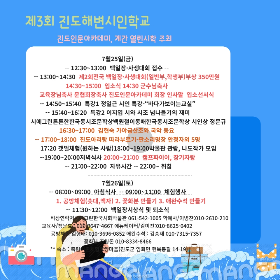 빵빵! 가수 박상철, 좋겠다! 가수 청이 7/25(금) 진도에 뜬다! 가수 박상철, 청이께서 제 3회 진도해변시인학교에 참석 예정입니다. 7/25(금) 시인과 가수, 모두가 함께하는 행사 속으로 초대합니다 많은 관심과 참여 부탁드립니다 ^^