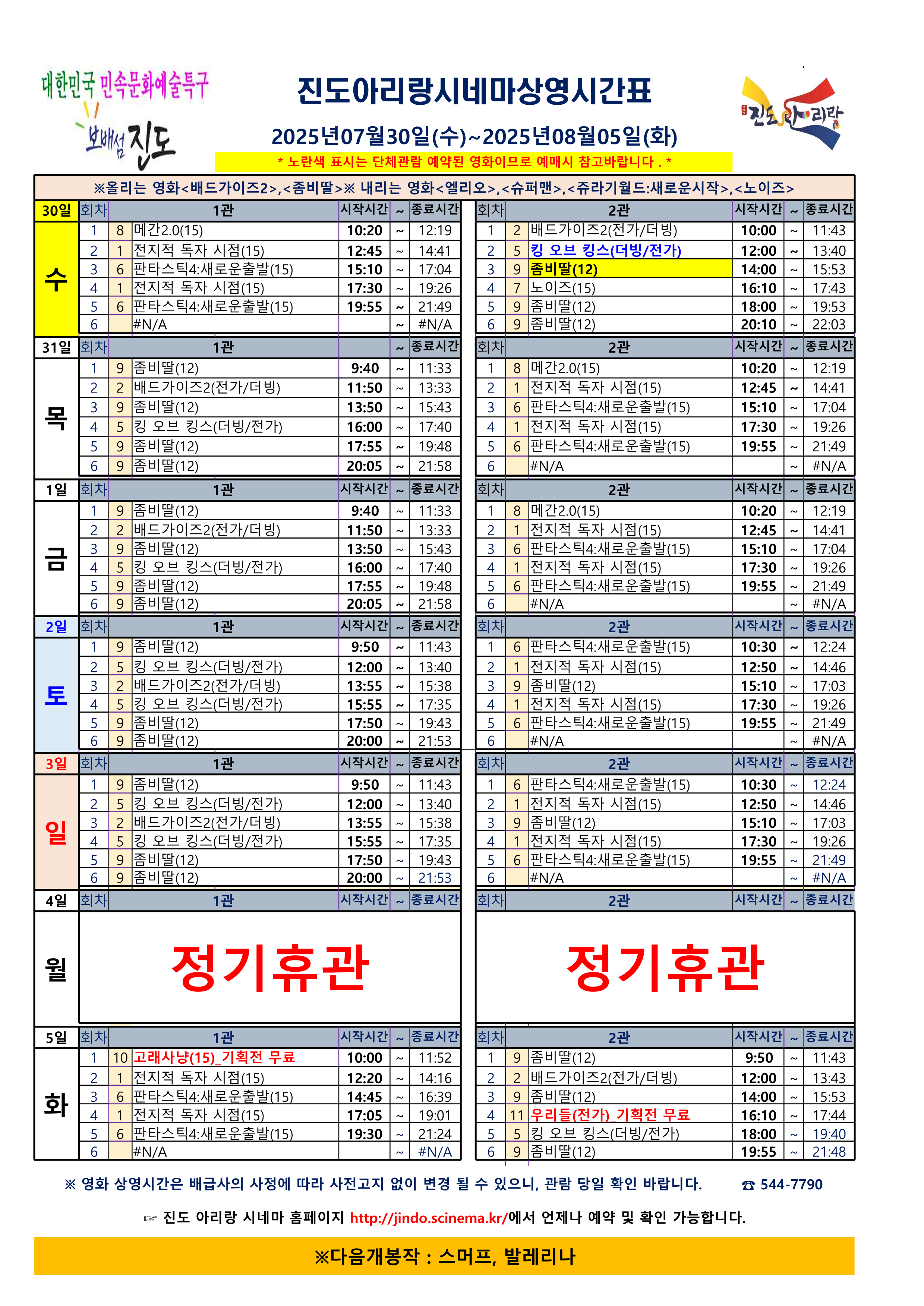 진도아리랑 시네마 상영시간표 <2025.07.30(수) ~ 08.05(화)> 안내드립니다.