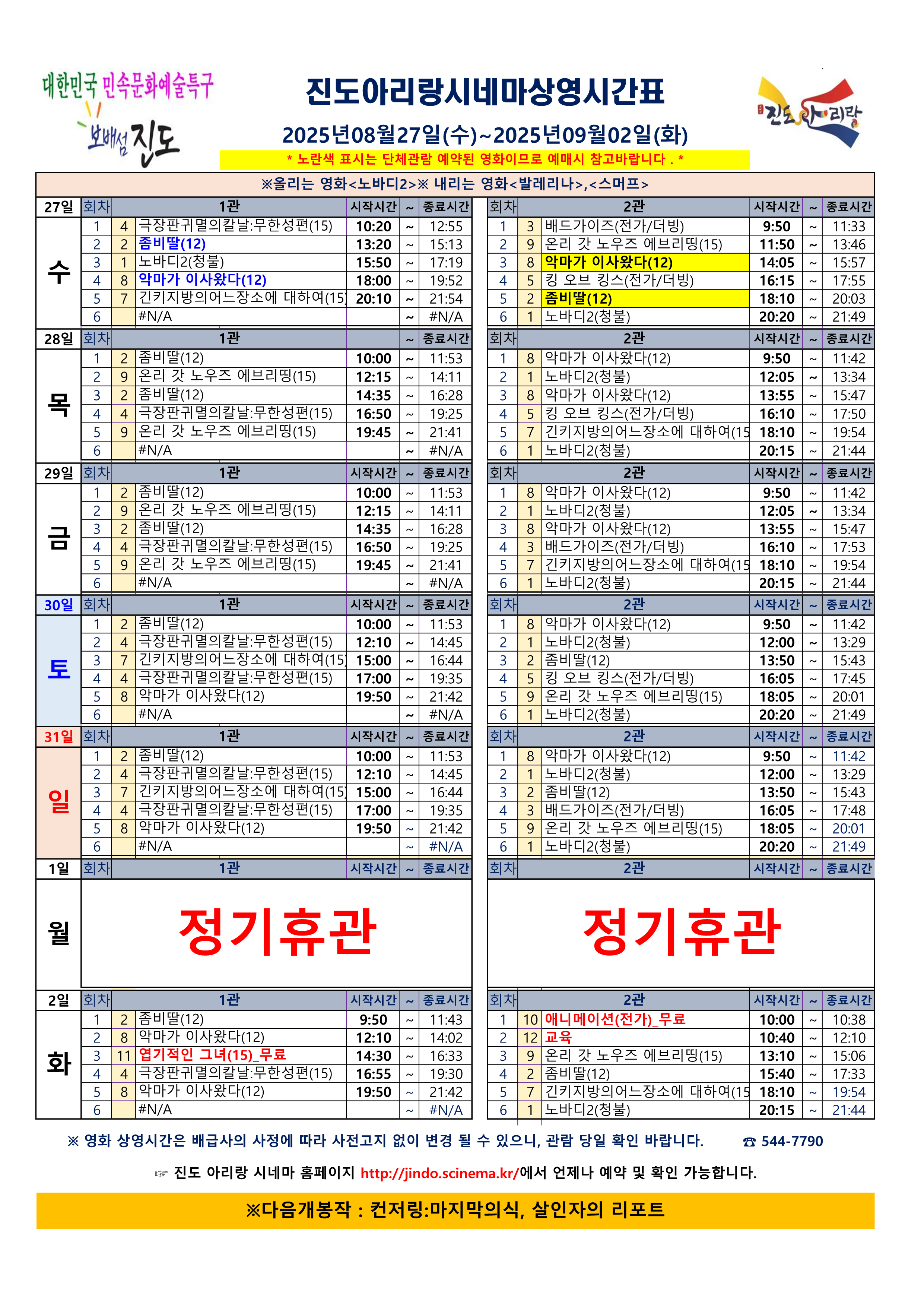 진도아리랑시네마 상영스케줄 <2025.08.27(수) ~ 09.02(화) >안내드립니다.