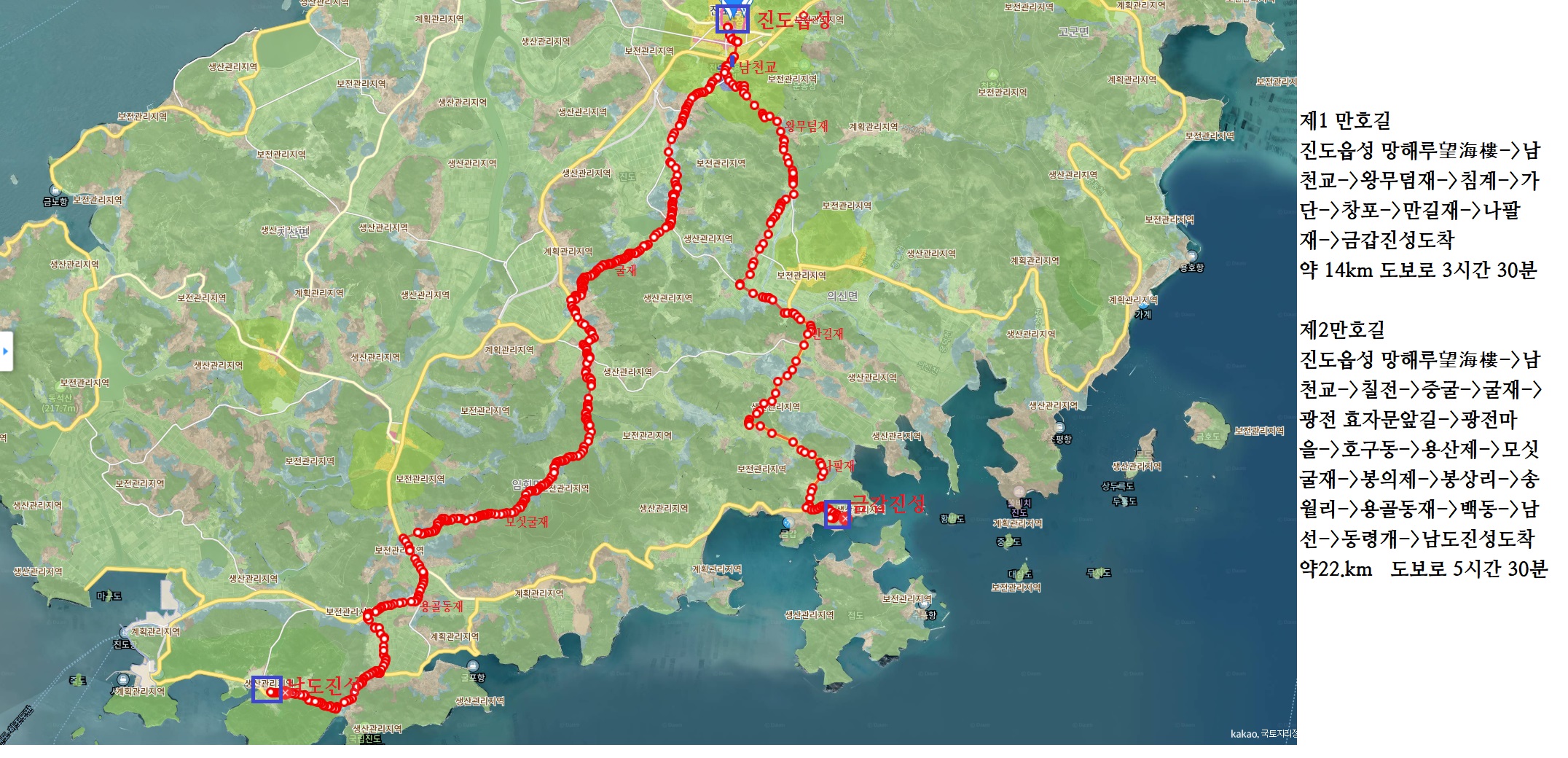 진도읍 남문을 출발하여, 하나는 금갑진성으로 가는 만호길로 진도읍성남문망해루(望海樓)->남천교->왕무덤재->침계. 가단, 창포->만길재->나팔재->댕기재-> 금갑진성으로 가는 (약 14km, 3시간 30분)길이다
