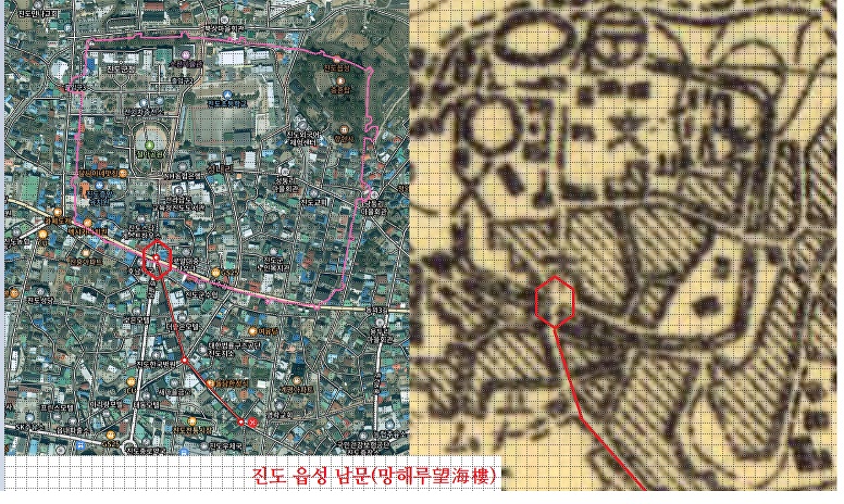 진도읍성 남문 망해루위치(현 지도와 1917년 진도 비교). 망해루: 누각에서 바다를 바라보는 곳.