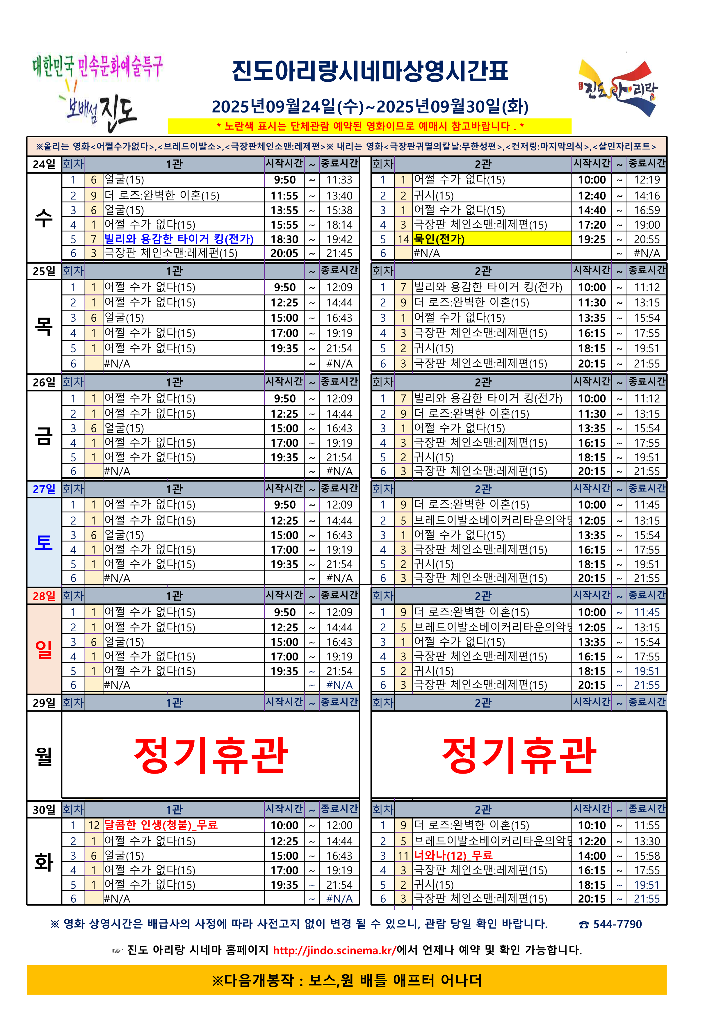 진도아리랑시네마 상영시간표 <2025.09.24(수) ~ 09.30(화)> 안내드립니다.