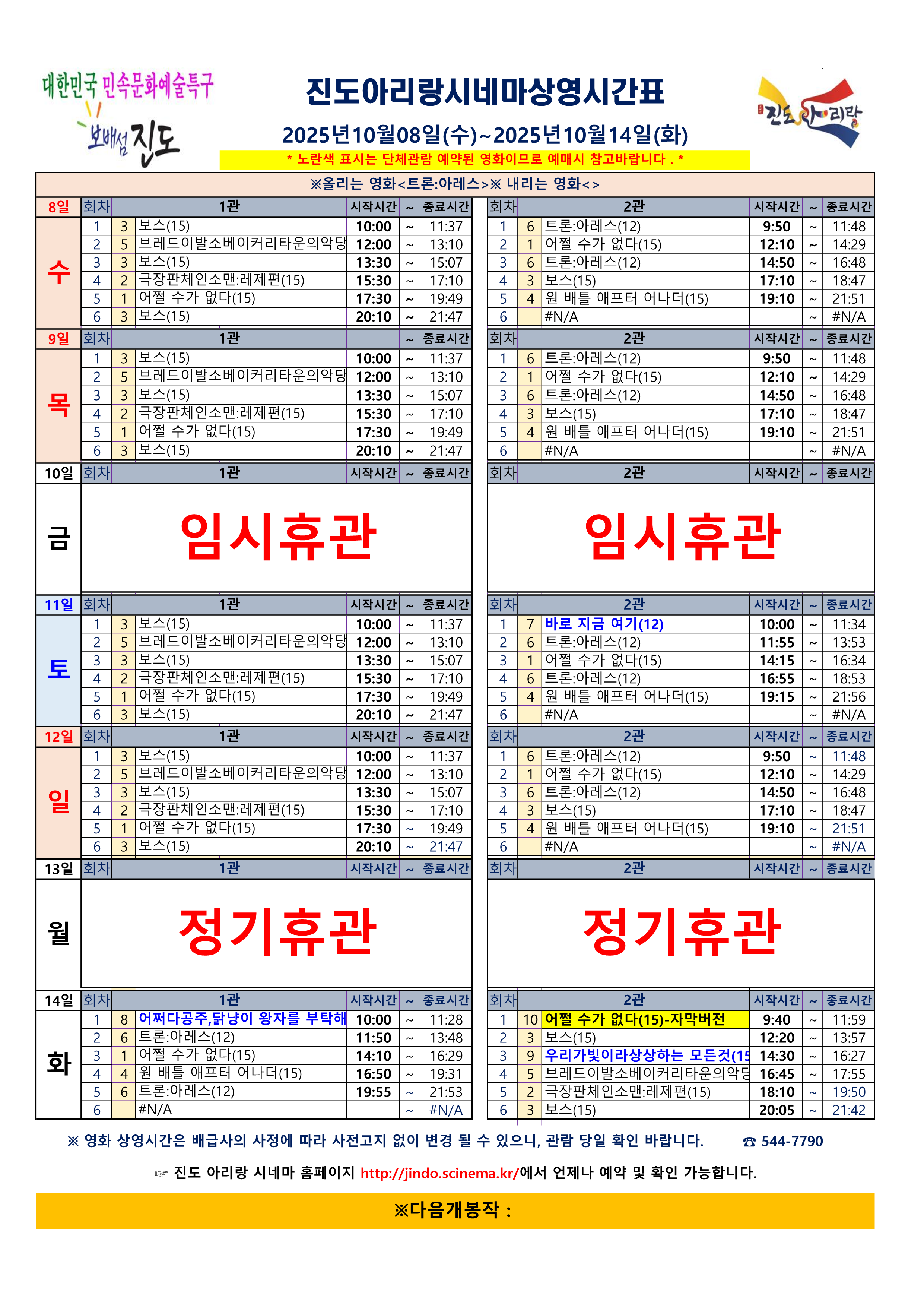 진도아리랑 시네마 상영시간표 <2025.10.08(수) ~ 10.14일(화)> 안내드립니다.
