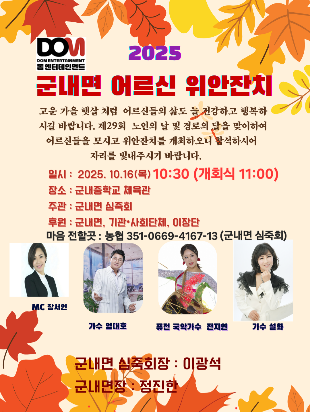 2025년 군내면 어르신 위안잔치 안내(2025. 10. 16.(목) 개회식 11:00 / 군내중학교)