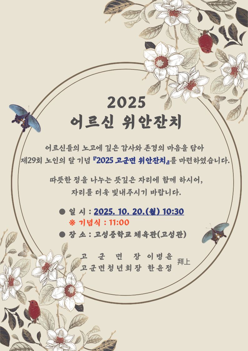 2025년 고군면 어르신 위안잔치 안내(2025. 10. 20.(월) 개회식 11:00 / 고성중학교)