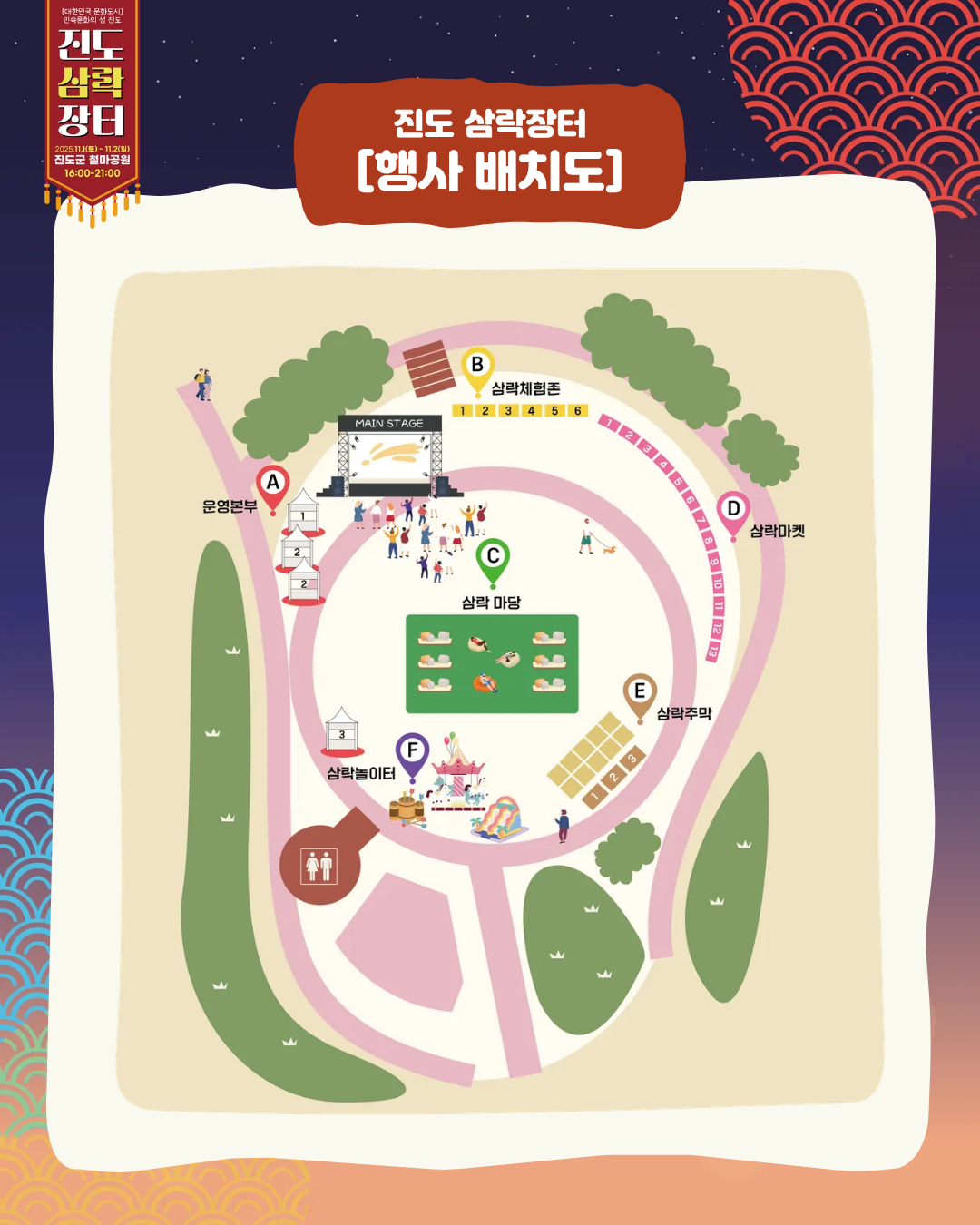 진도 삼락장터 일시 : 2025년 11월 1일 ~ 11월 2일 장소 : 진도읍 철마공원 진도의 전통문화 자산인 [홍주 / 노래 / 서화]를 활용한 테마형 문화장터가 철마공원에서 개최됩니다. 군민여러분의 많은 관심과 참여 부탁드립니다.