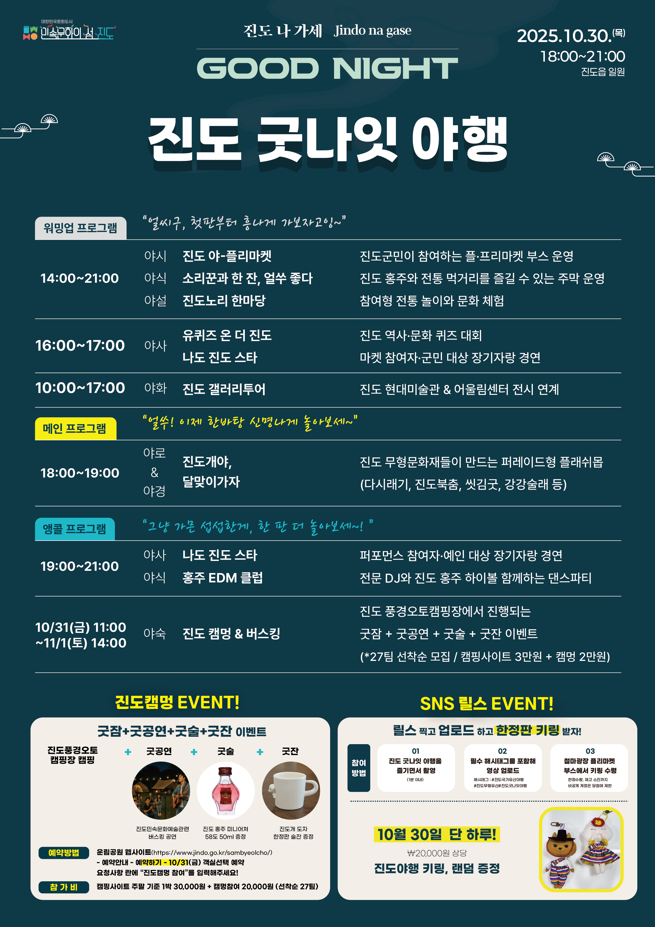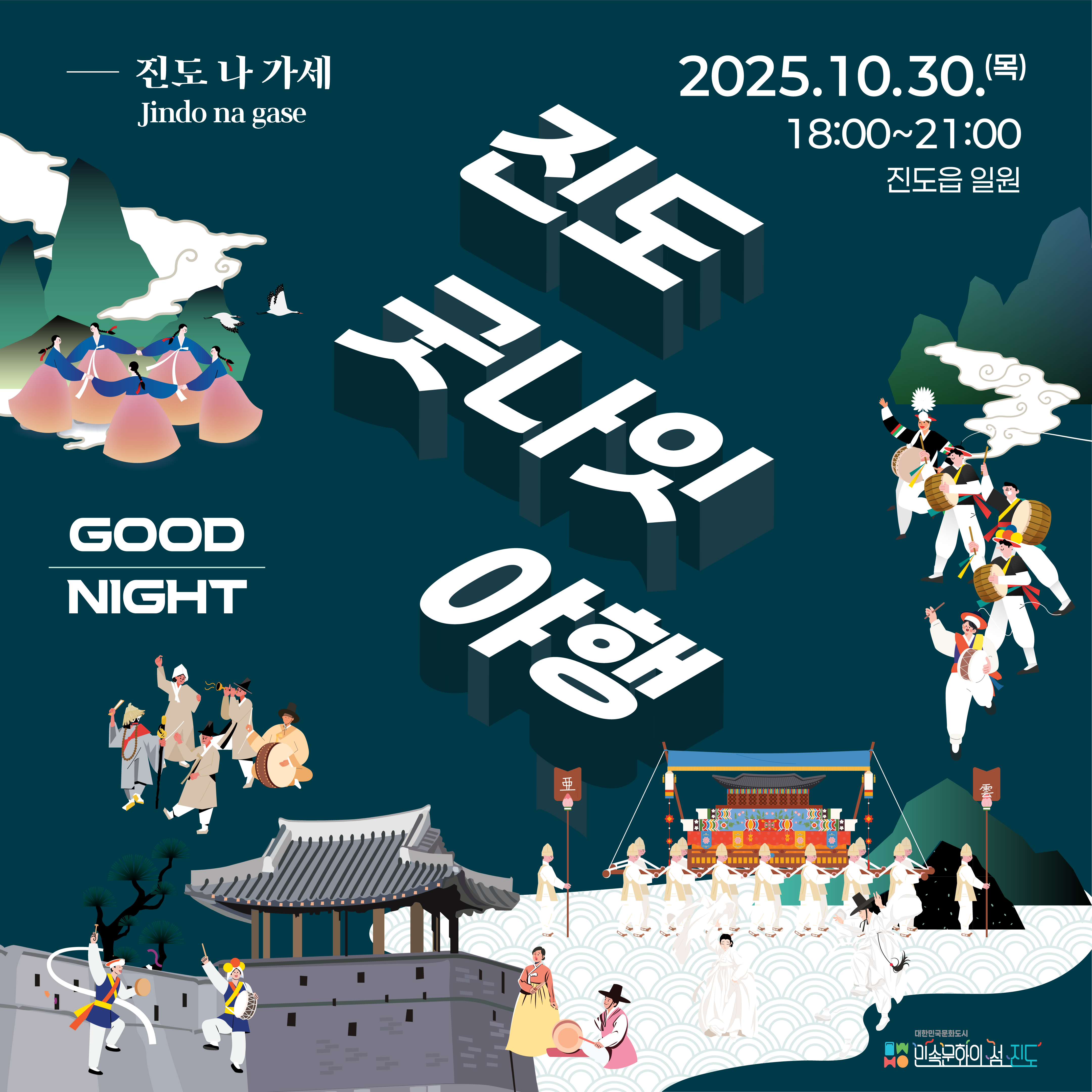 진도 굿나잇 야행 14:00 ~ 21:00 진행 야행 퍼레이드 시간 18:00 ~ 20:00 퍼레이드 시간에 읍사무소 ~ 회전교차로 ~ 철마공원 일대 차량 통제됨을 알려드립니다. 군민 여러분의 많은 참여와 협조 부탁드립니다.