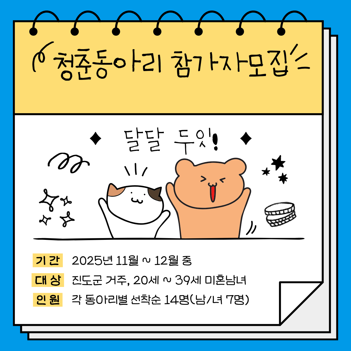 진도군에서는 청년 맞춤형 동아리 클래스 개설로 청년의 역량을 강화하고자 "달달두잇* 청춘동아리" 참가자를 모집하니 많은 신청바랍니다.