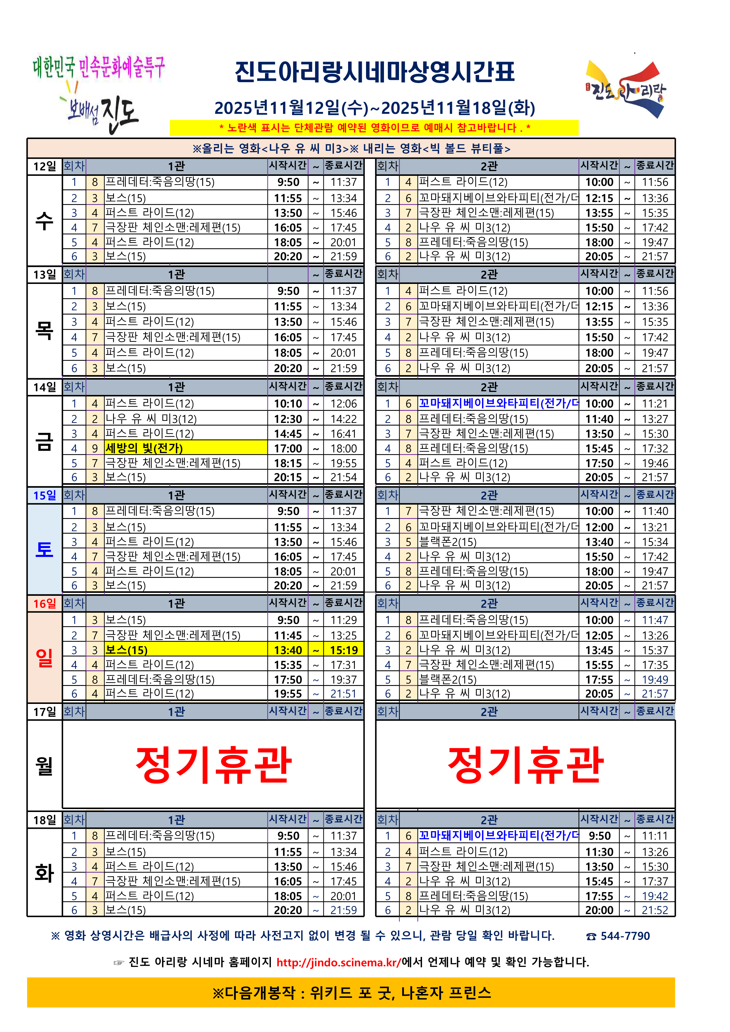 진도아리랑 시네마 상영시간표 < 2025.11.12(수) ~ 11.18(화)> 안내드립니다.