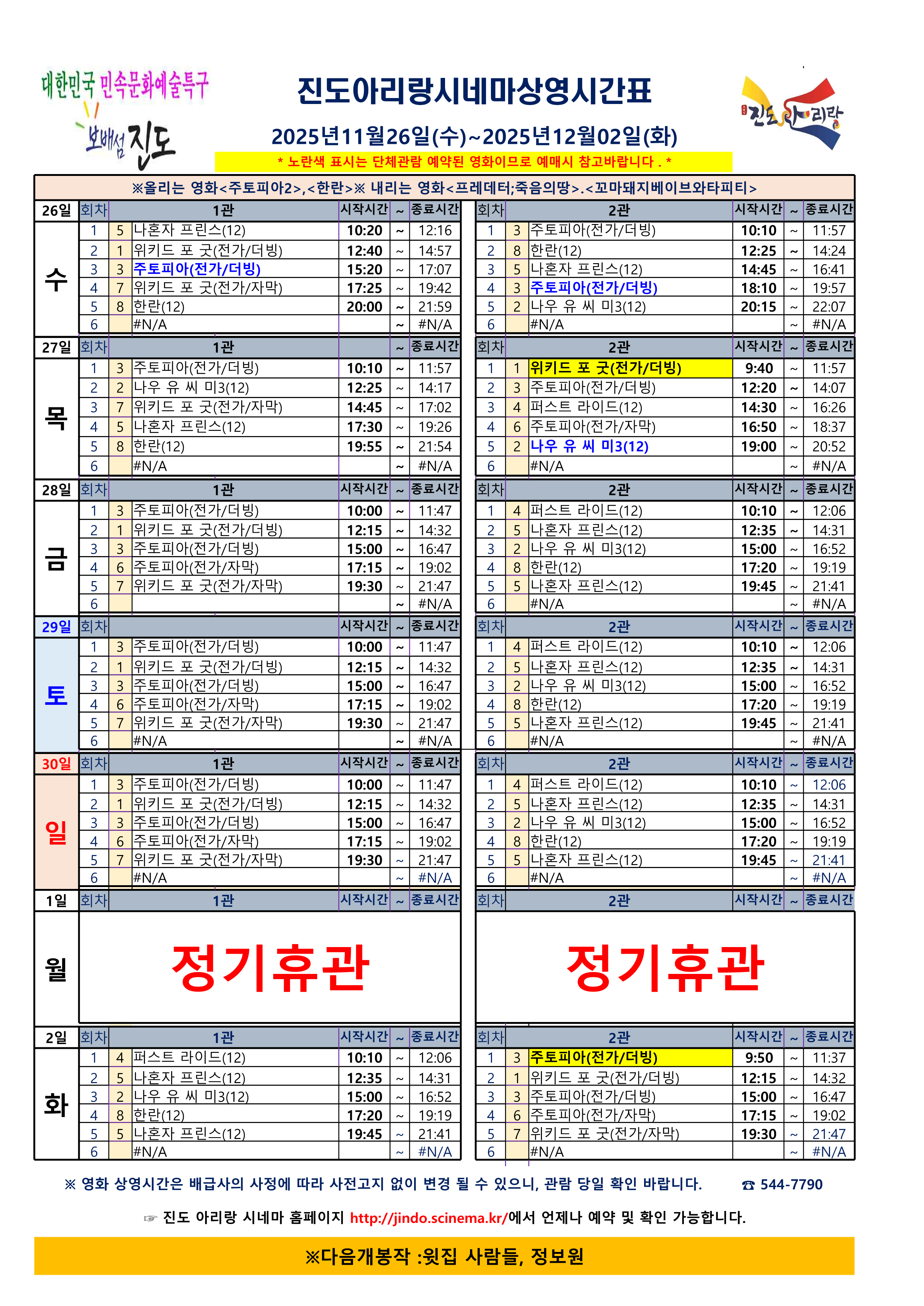 진도아리랑 시네마 상영 시간표 <2025.11.26(수) ~ 12.02(화)> 안내드립니다.