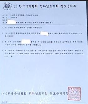 위 두 사진은 (사) 한국국악협회 전라남도 지회와 진도군 지부가 2024년 1월 2일과 2024년 2월 5일 (사) 한국국악협회 전라남도 지회 진도군 지부 ㅇㅇㅇ회원의 광주 절도사건(202*.00.00.)에 대한 조사요청(3회)이 들어와 서로 주고받은 경위서 공문이다.