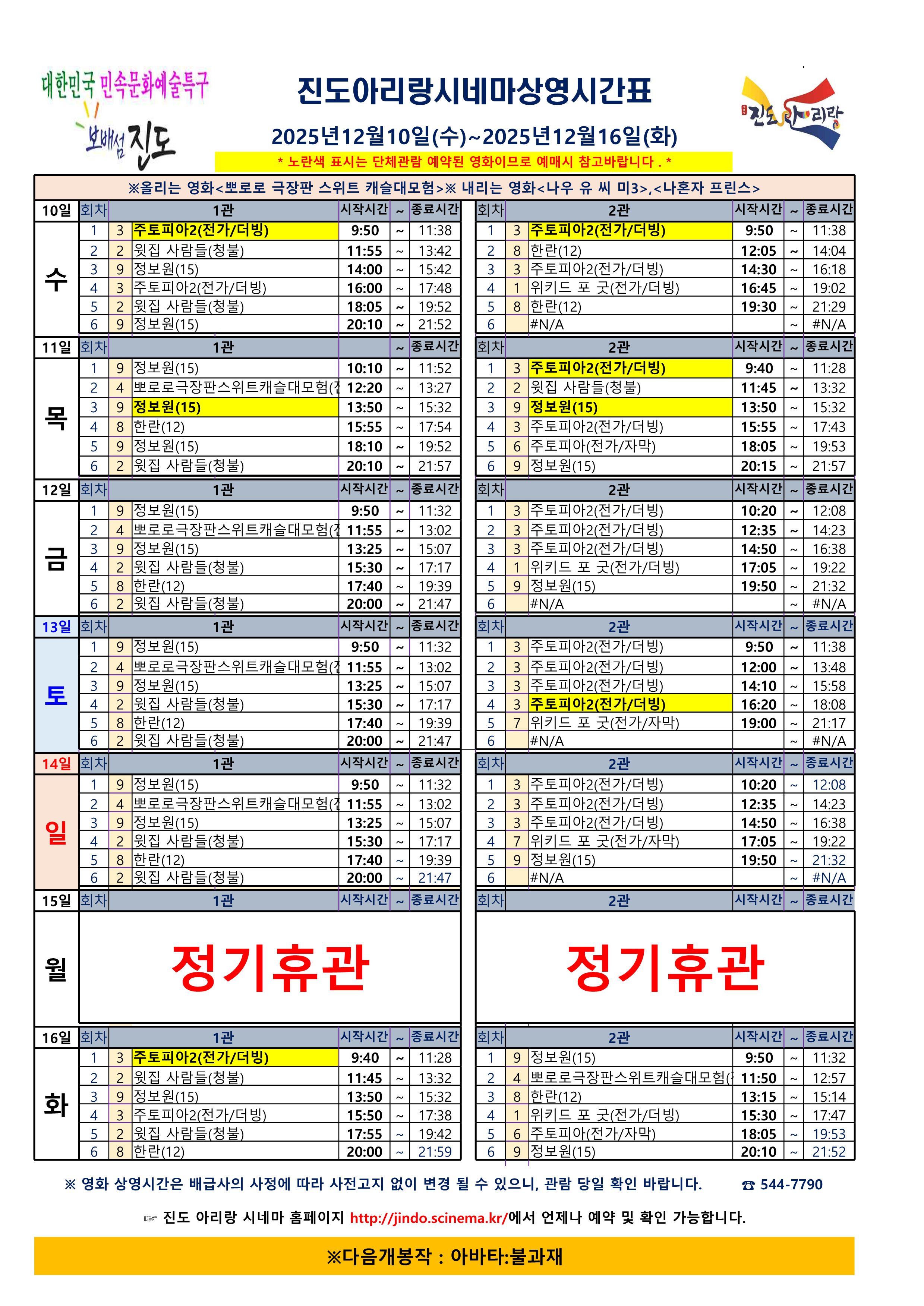 진도아리랑시네마 상영시간표 <2025.12.10(수) ~ 12.16(화)> 안내드립니다.