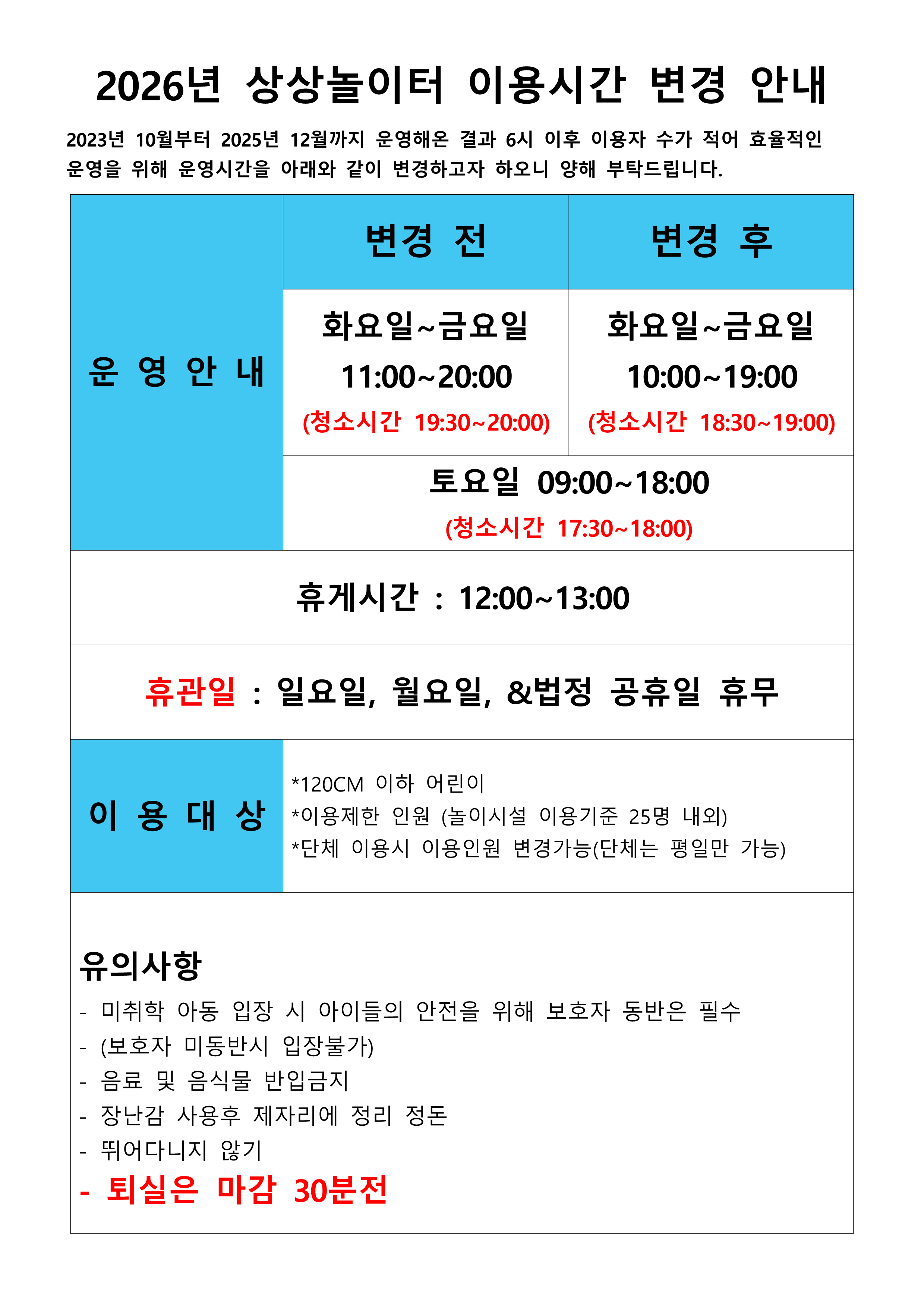 2026년 상상놀이터 운영시간 변경안내