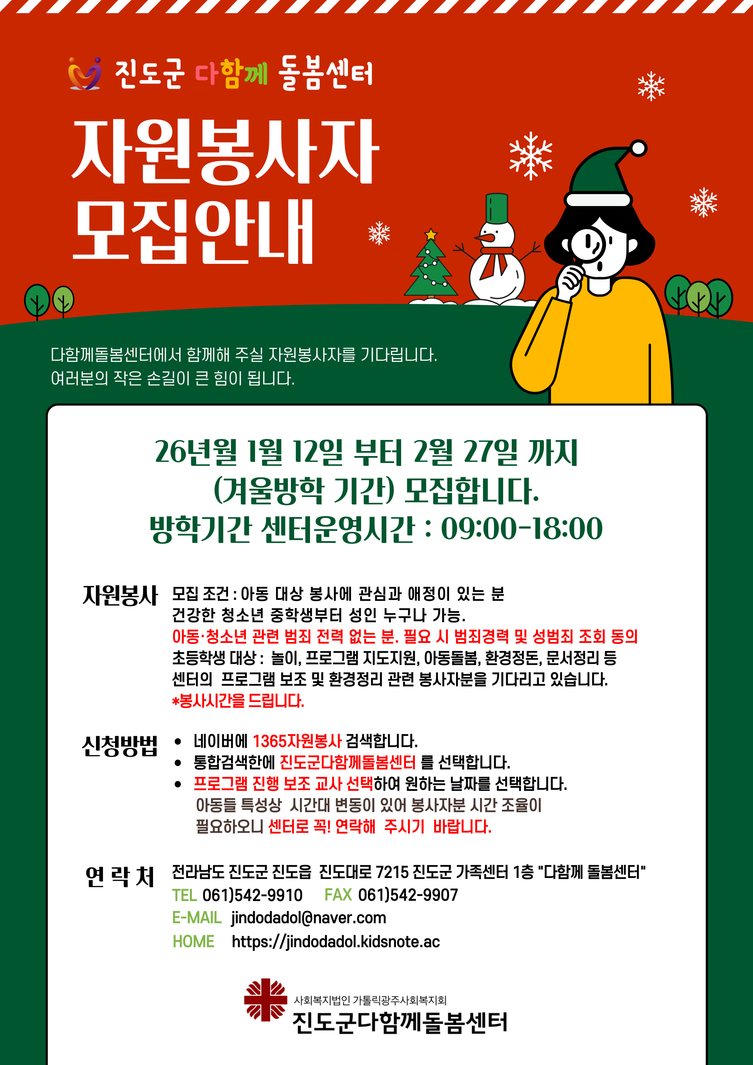 진도군다함께돌봄센터 ★겨울방학기간 자원봉사자★ 모집 안내