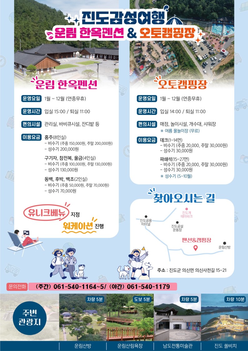 전화: 주간 (061-540-1164~5) / 야간 (061-540-1179) / 오토캠핑장 (061-542-1180)