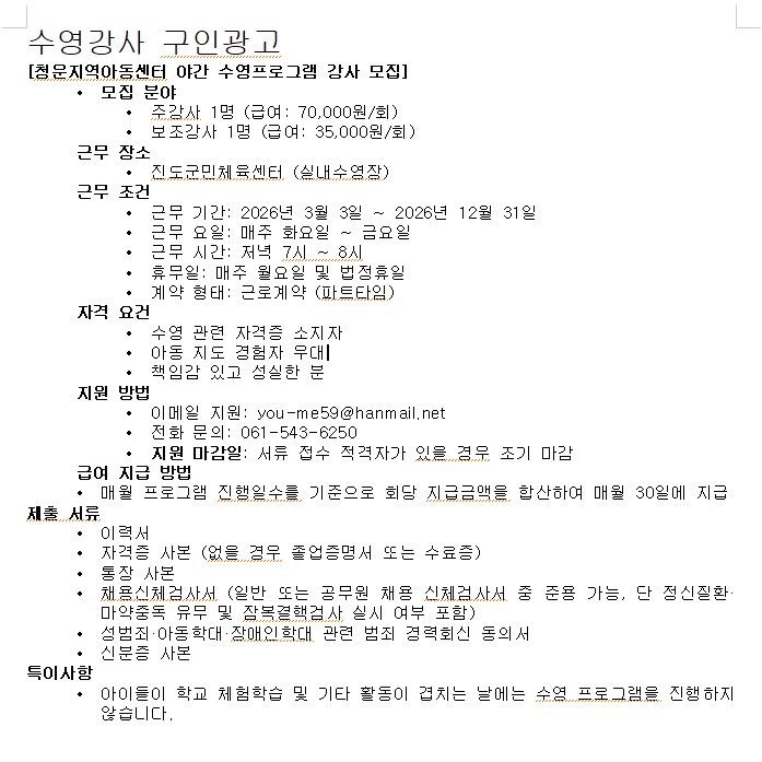 [청운지역아동센터 야간 수영프로그램 강사 모집]