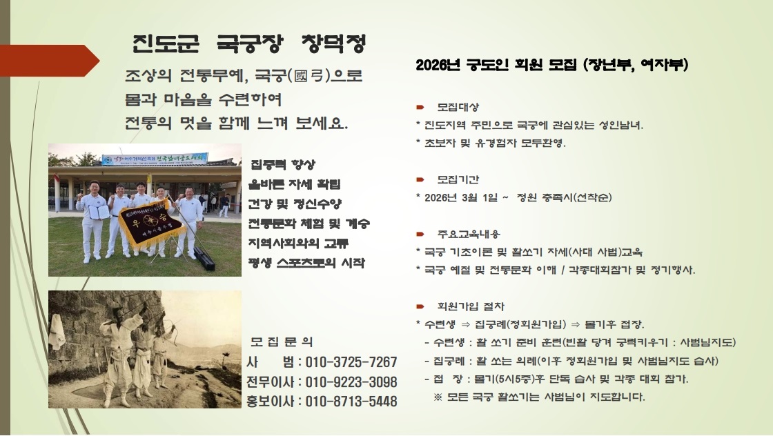 진도군 국궁장 창덕정 에서 궁도인 회원을 모집합니다.