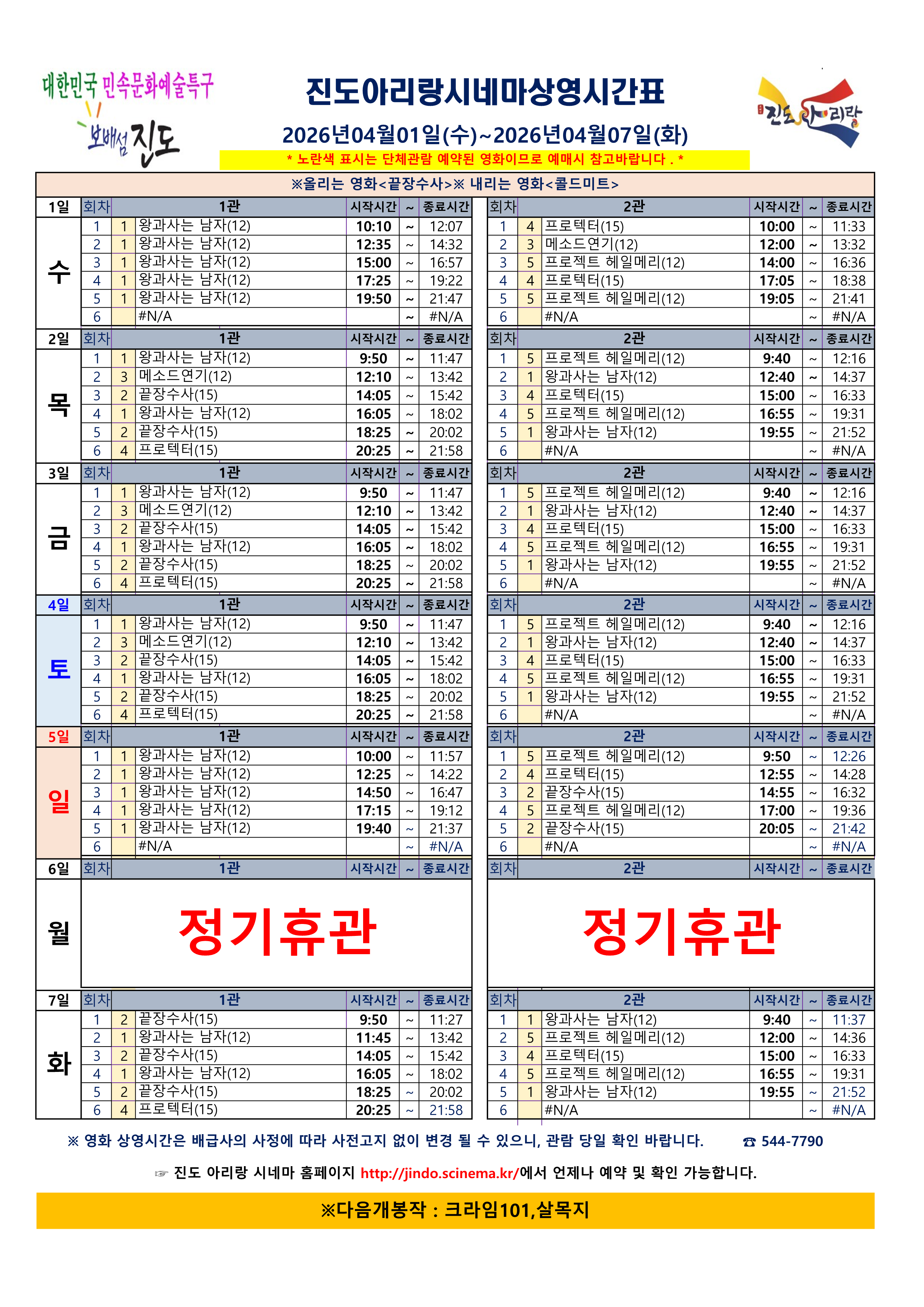진도아리랑시네마 상영시간표 <2026.04.01(수) ~ 04.07(화)> 안내드립니다.