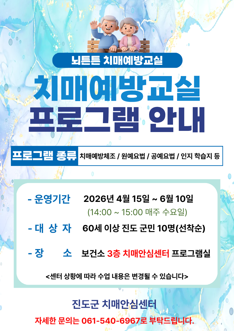 안녕하세요! 진도군 치매안심센터 입니다. 치매예방교실 프로그램(상반기) 대상자를 선착순 모집합니다. 참여 비용은 무료!! 60세 이상 진도군민이라면 누구나 가능! 많은 신청 바랍니다. 궁금한 사항은 보건소 3층 치매안심센터 방문 또는 061-540-6967로 문의 바랍니다. 많은 관심과 참여 부탁드립니다. 감사합니다.