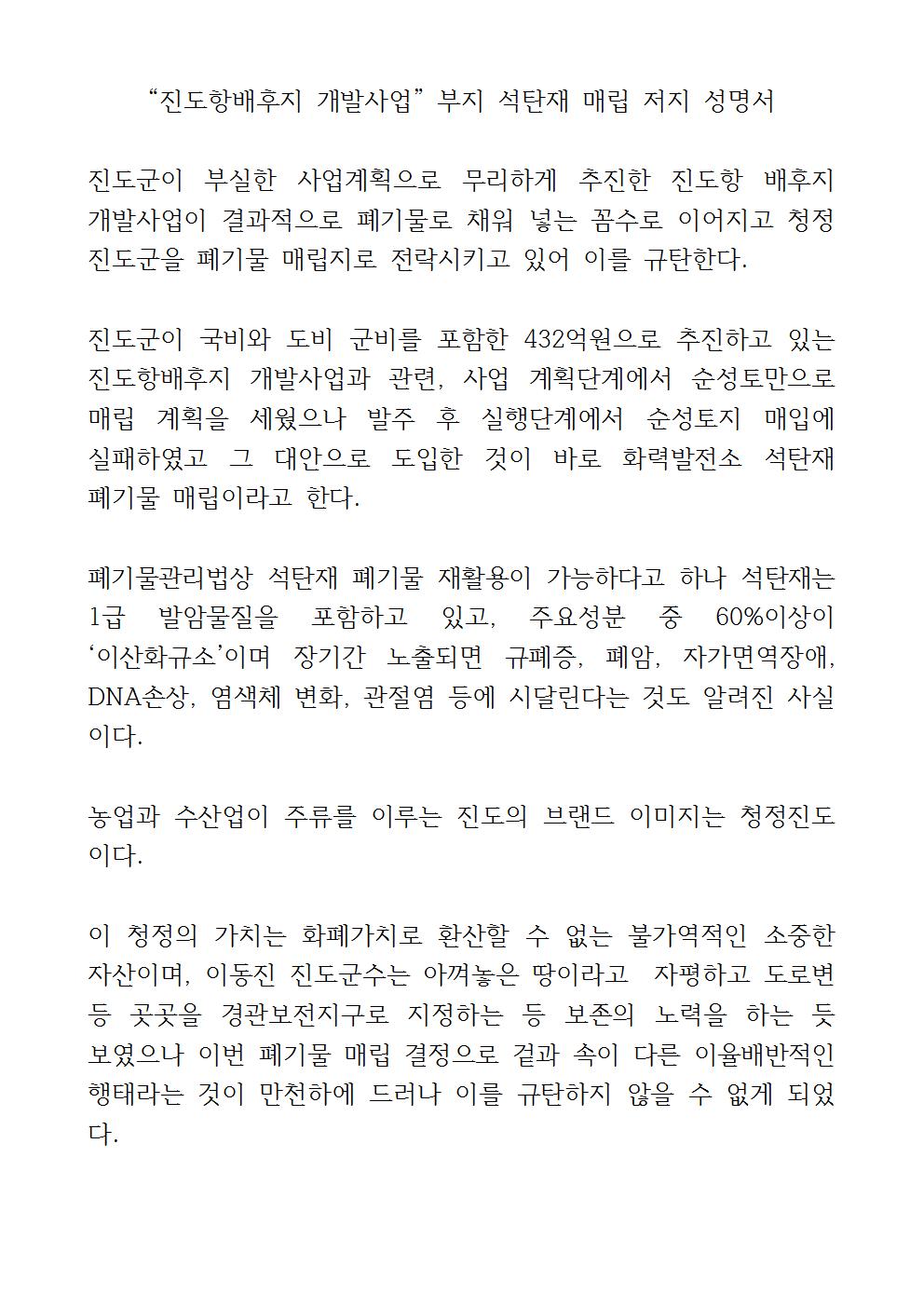 2년여만에 또다시 석탄재 폐기물 매립 망령이 되살아나 진도를 어지럽게 하는군요.