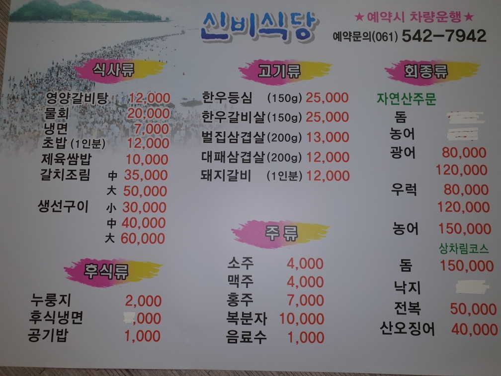 - 식사류 : 갈치조림, 생선구이, 물회, 냉면, 초밥, 제육쌈밥, 영양갈비탕