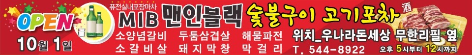 숯불구이 고기포차 맨인블랙이 태풍을 뚫고 드디어 오픈했습니다.^^ 오후 5시부터 12시까지 영업합니다.