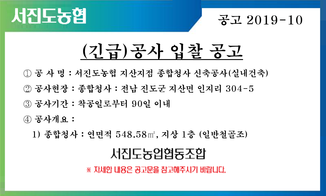 제목 [입찰공고] 서진도농협 지산지점 종합청사 신축공사(실내건축)
