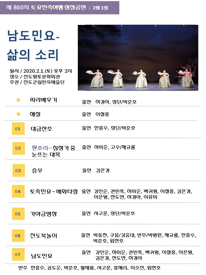 진도 토요민속여행 상설공연 2월 1일 / 남도민요- 삶의 소리