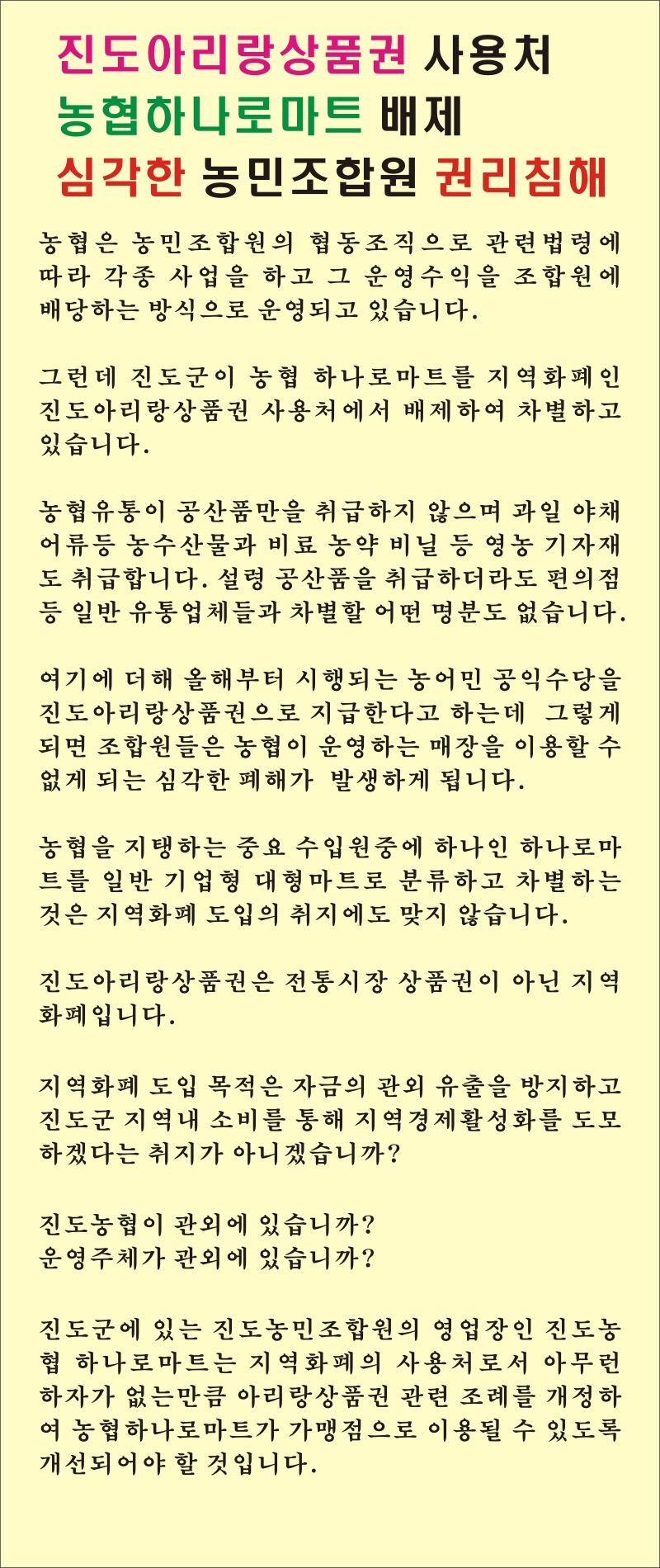 지역화폐 "진도아리랑 상품권" 하나로마트 사용 금지는 농어민 권리 침해