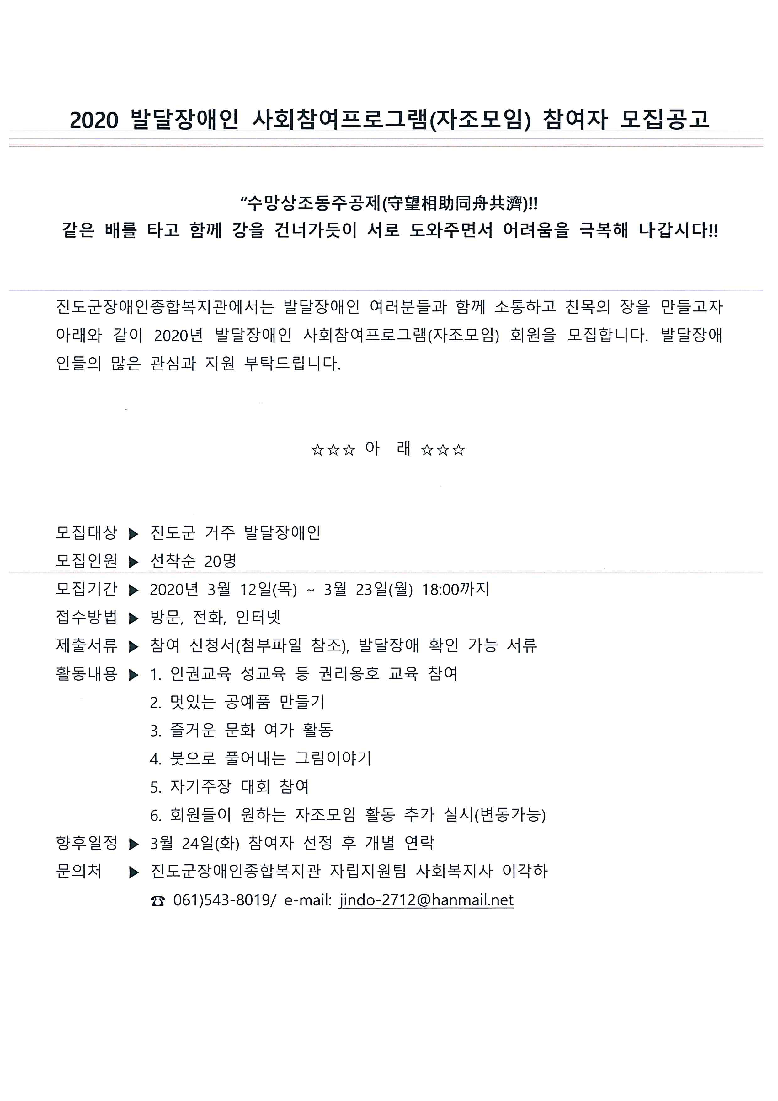2020 발달장애인 사회참여프로그램 참여자 모집공고