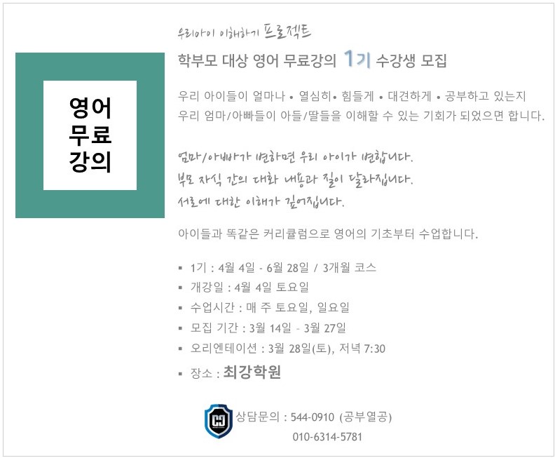 최강학원...우리아이 이해하기 프로젝트!! 학부모 대상 영어 무료강의 1기 수강생 모집