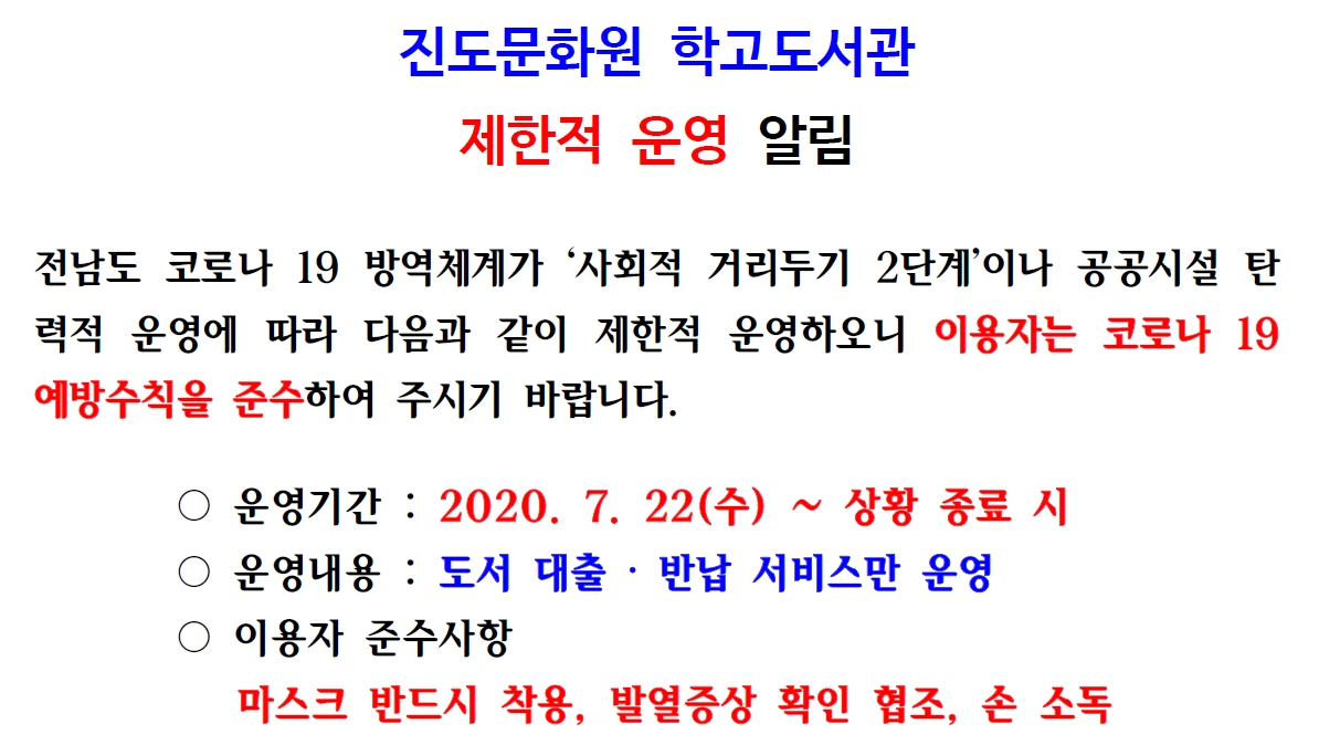 진도문화원 학고도서관 제한적 운영 알림