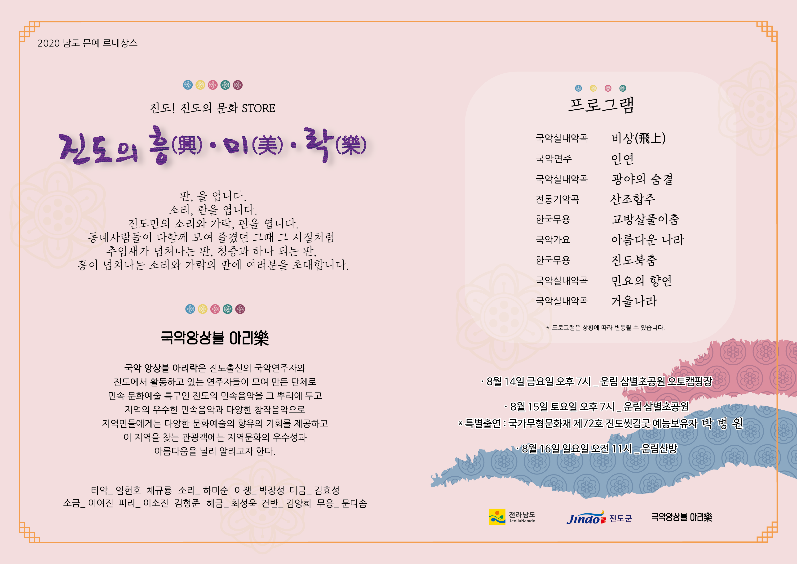2020 남도문예 르네상스 사업! 진도의 흥 미 락!! 코로나19 때문에 많이 지치시고 답답하셨죠!! 국악앙상블 아리락이 군민들의 스트레스를 한여름밤의 국악의 이야기로 한방에날려버릴 공연을 준비했습니다. 사랑하는 가족과 지인, 그리고 연인들과 함께 놀러오세요~~~ 사회적 거리두기로 인하여 마스크는 필수입니다.