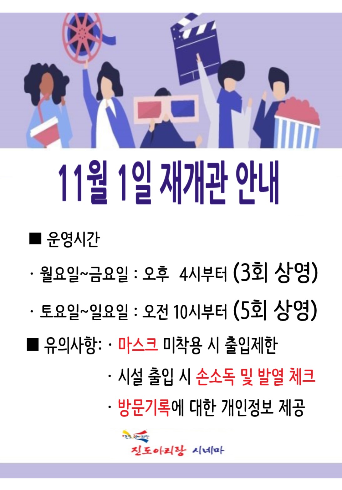 진도 아리랑시네마 11월 1일 재개관 알림