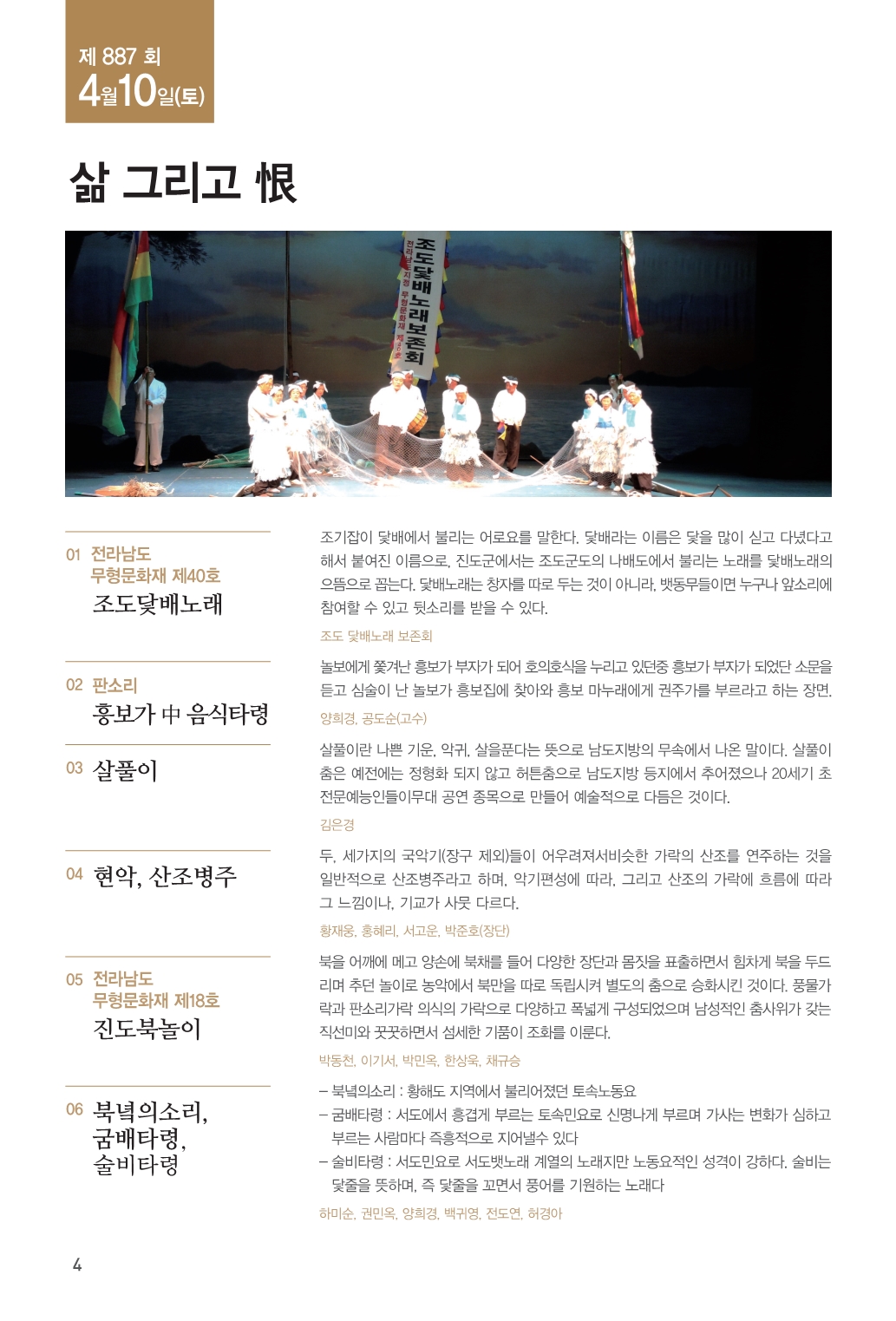 진도씻김굿 전수조교이자 송가인 가수의 어머니로 잘 알려진 송순단씨가 출연하는 진도씻김굿 공연과,