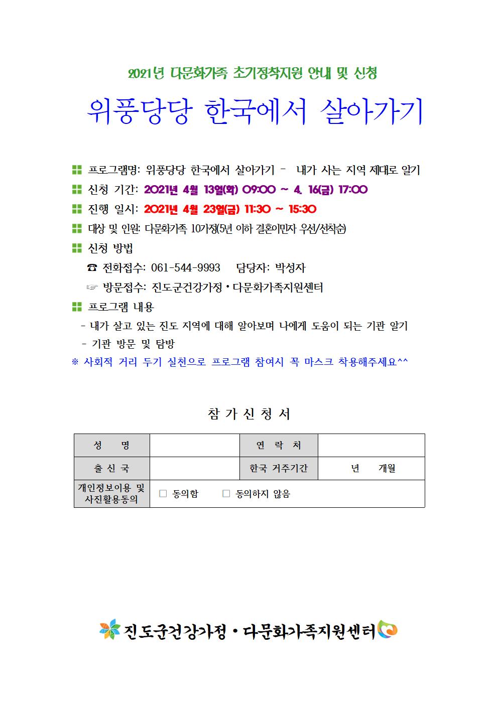 2021년 다문화가족 초기정착지원 프로그램 '위풍당당 한국에서 살기' 안내