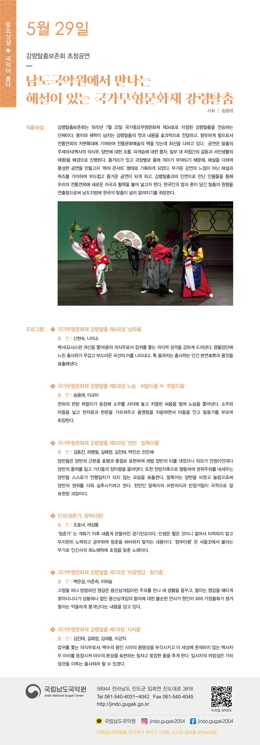 국가무형문화재 강령탈춤을 해설과 함께 국립남도국악원 야외 특설무대에서 만나보세요~