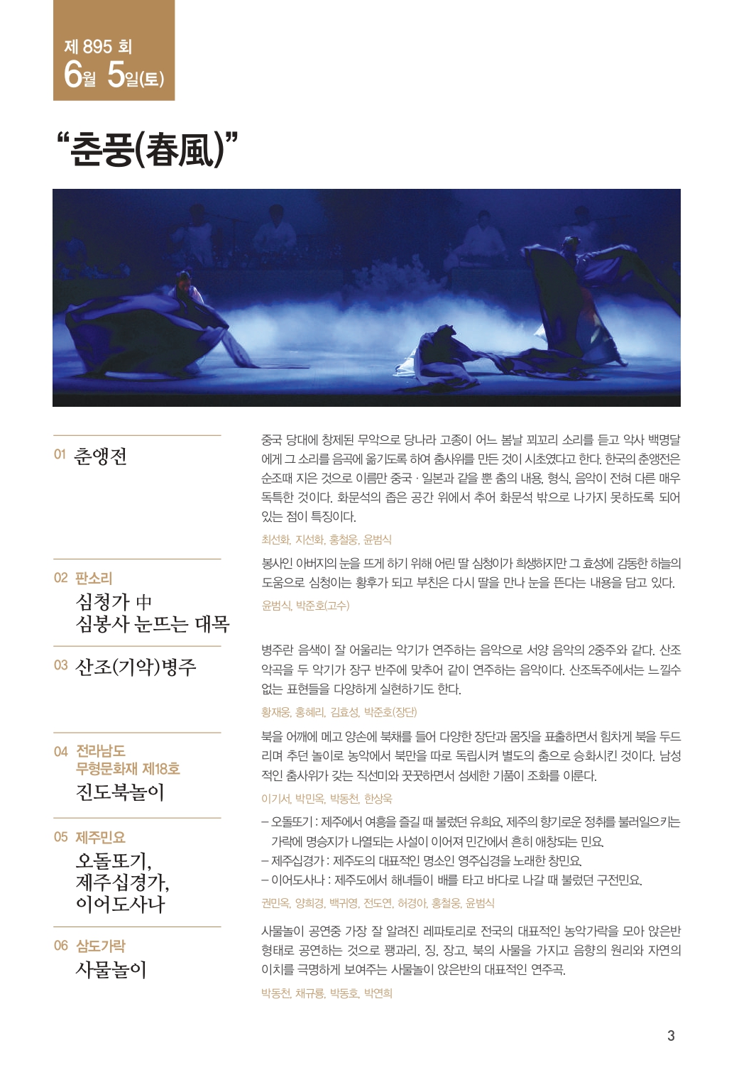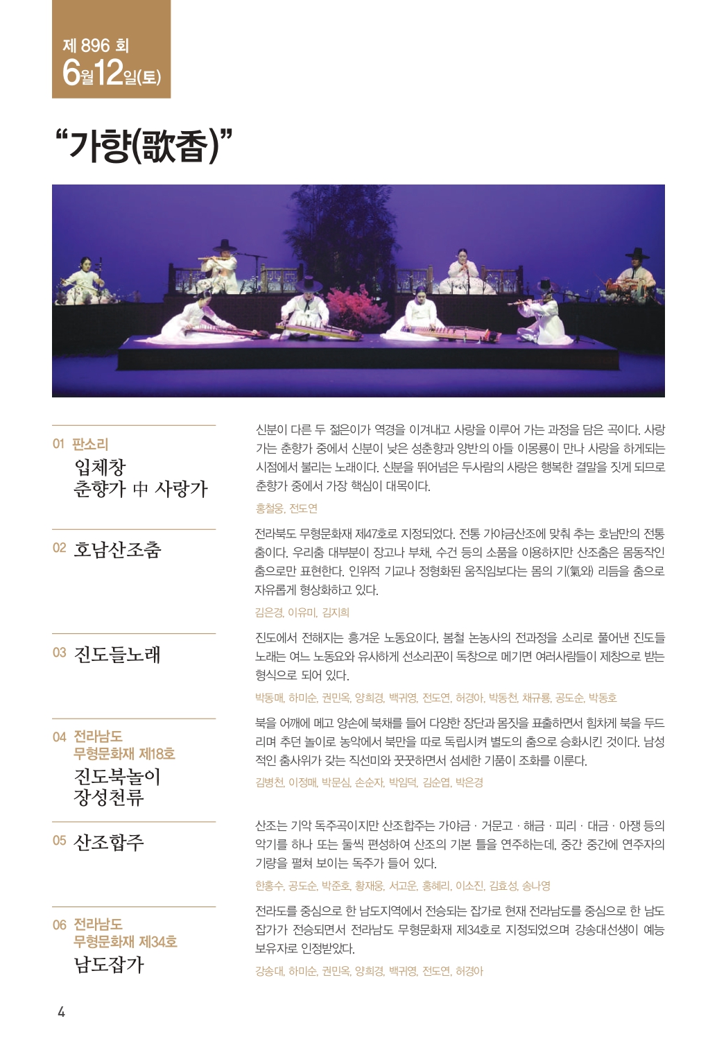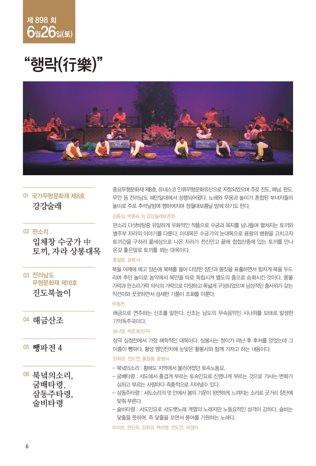 전라남도 무형문화재 제18호 진도북놀이, 춘앵전, 판소리, 기악병주 등 다양한 공연이 준비되어 있습니다.