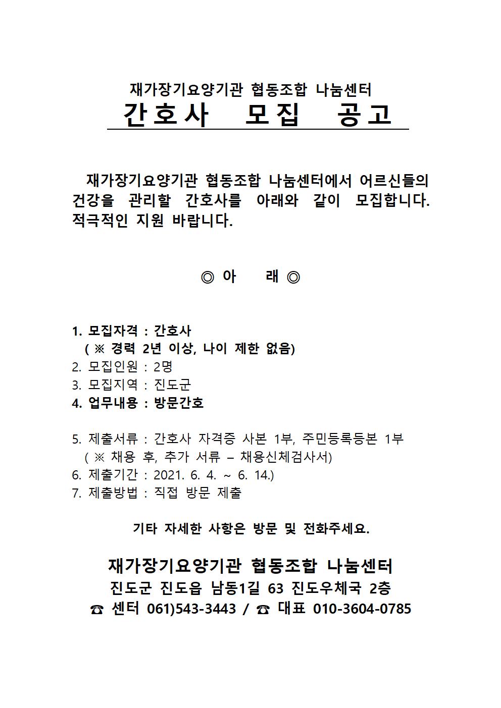 재가서비스 간호사 2명 모집 공고