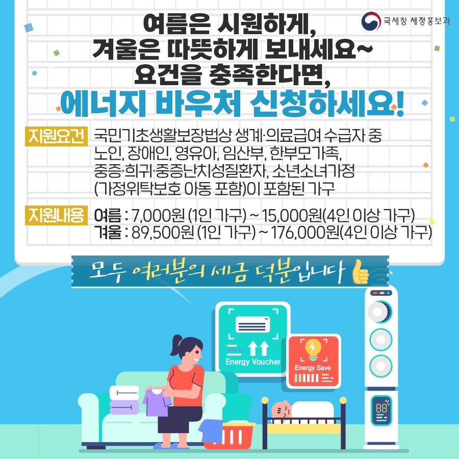 (국세청)여름은 시원하게, 겨울은 따뜻하게 보내요~! 요건을 충족한다면, 에너지 바우처 신청하세요!