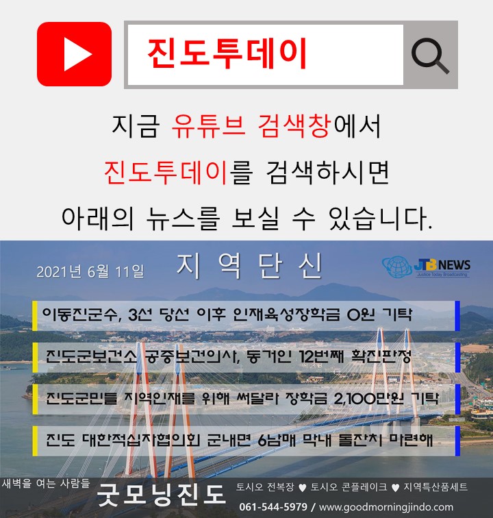 ☞지금 유튜브에 진도투데이 or 지역단신을 검색하세요 ☜
