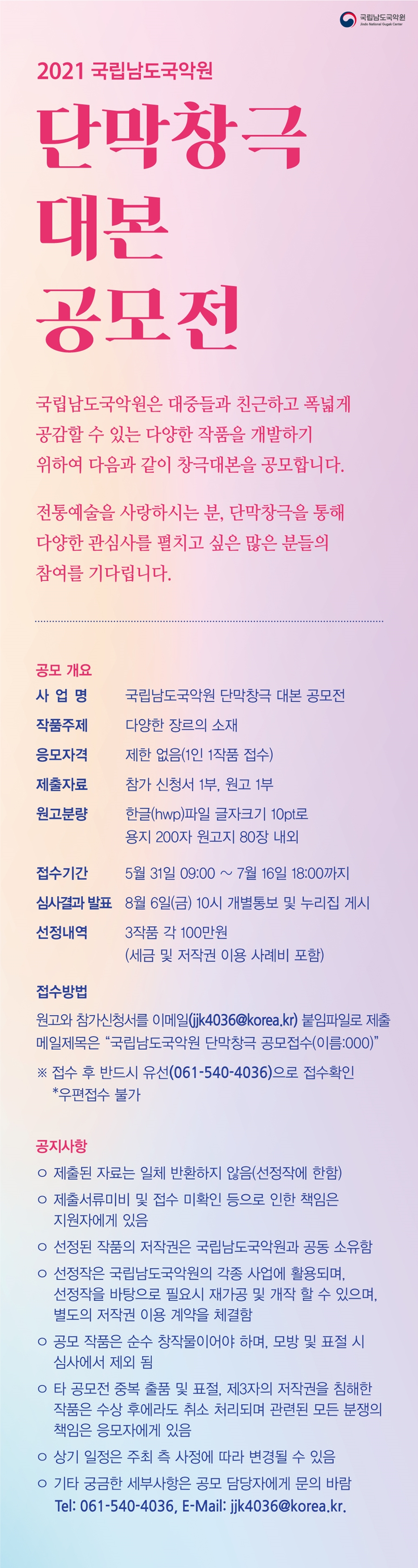 국립남도국악원은 대중들과 친근하고 폭넓게 공감할 수 있는 다양한 작품을 개발하기 위하여 다음과 같이 창극대본을 공모합니다.