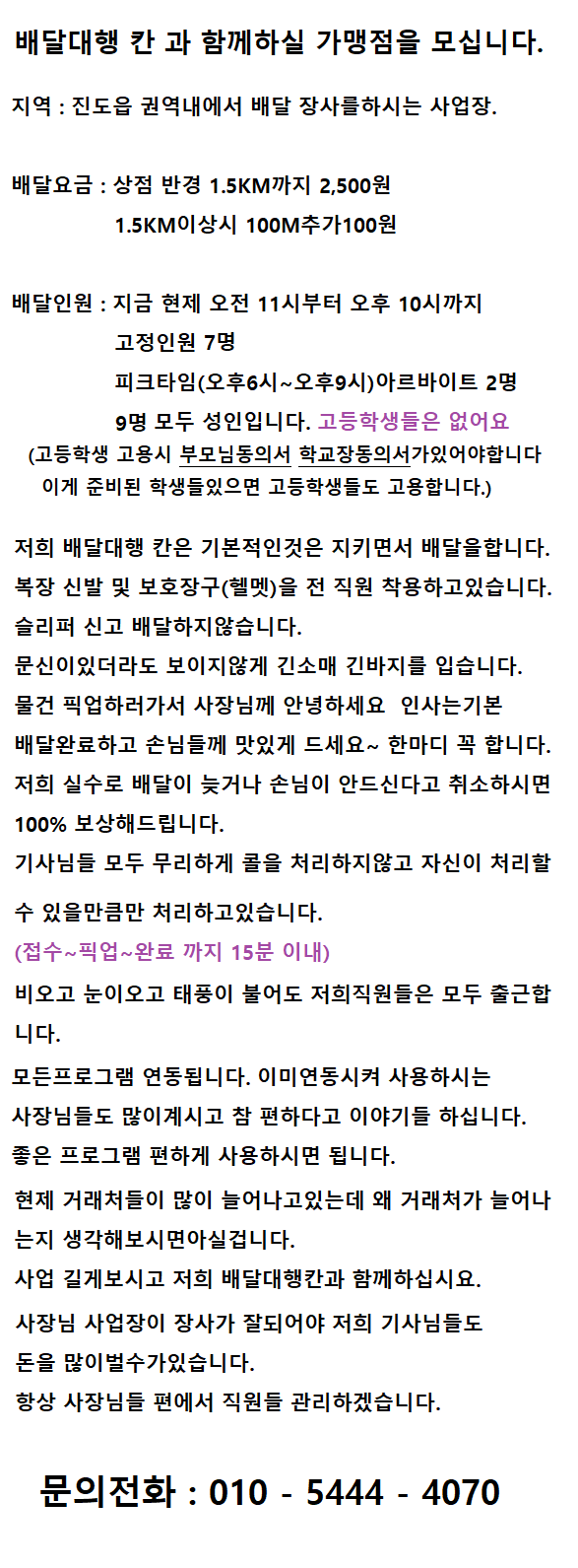 <<<<< 배 달 대 행 칸 >>>>>과 함께하실 가맹점을 모십니다.