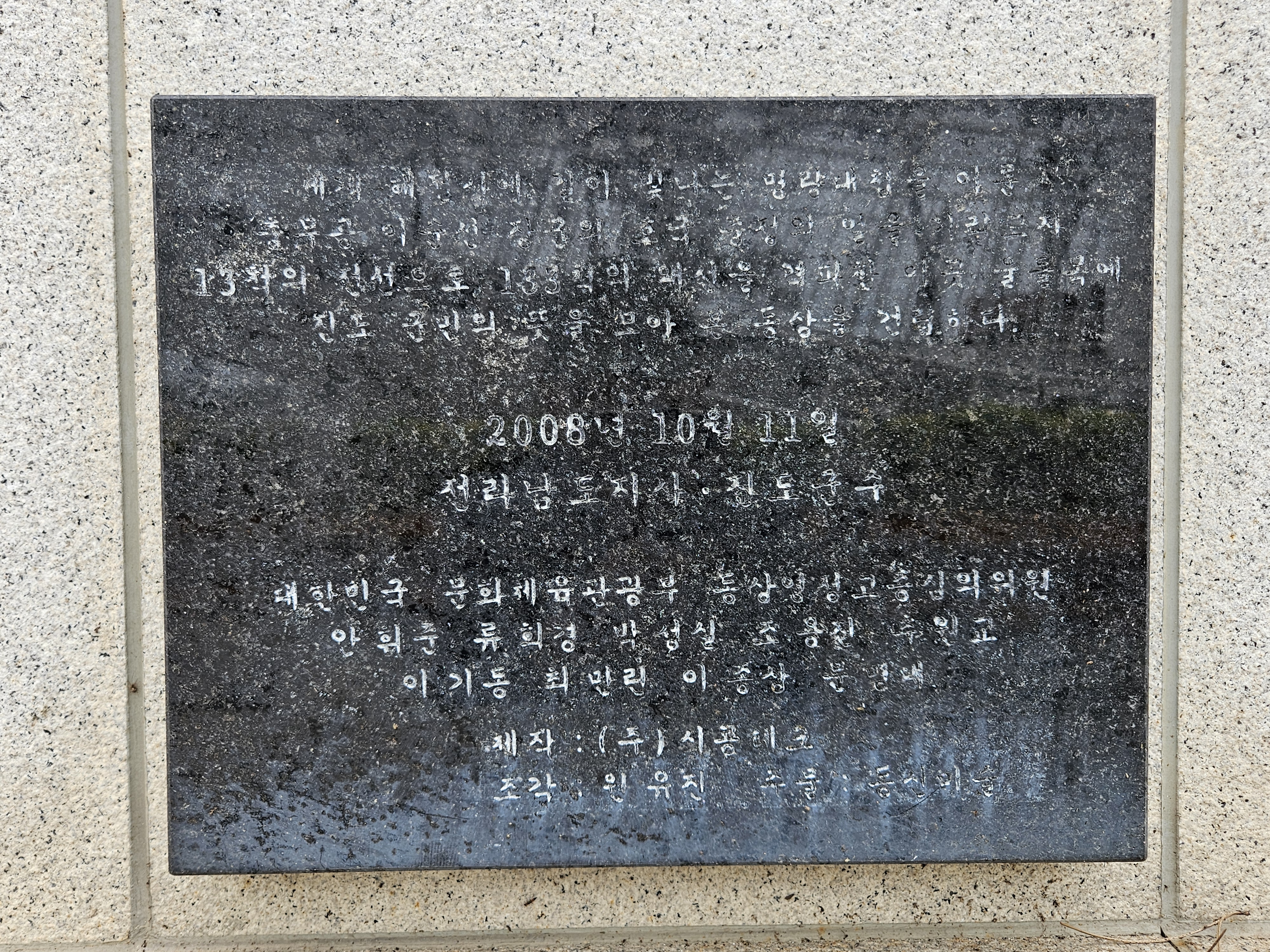 2008년 설치한 이순신 장군 동상 머릿돌 글씨가 훼손되어